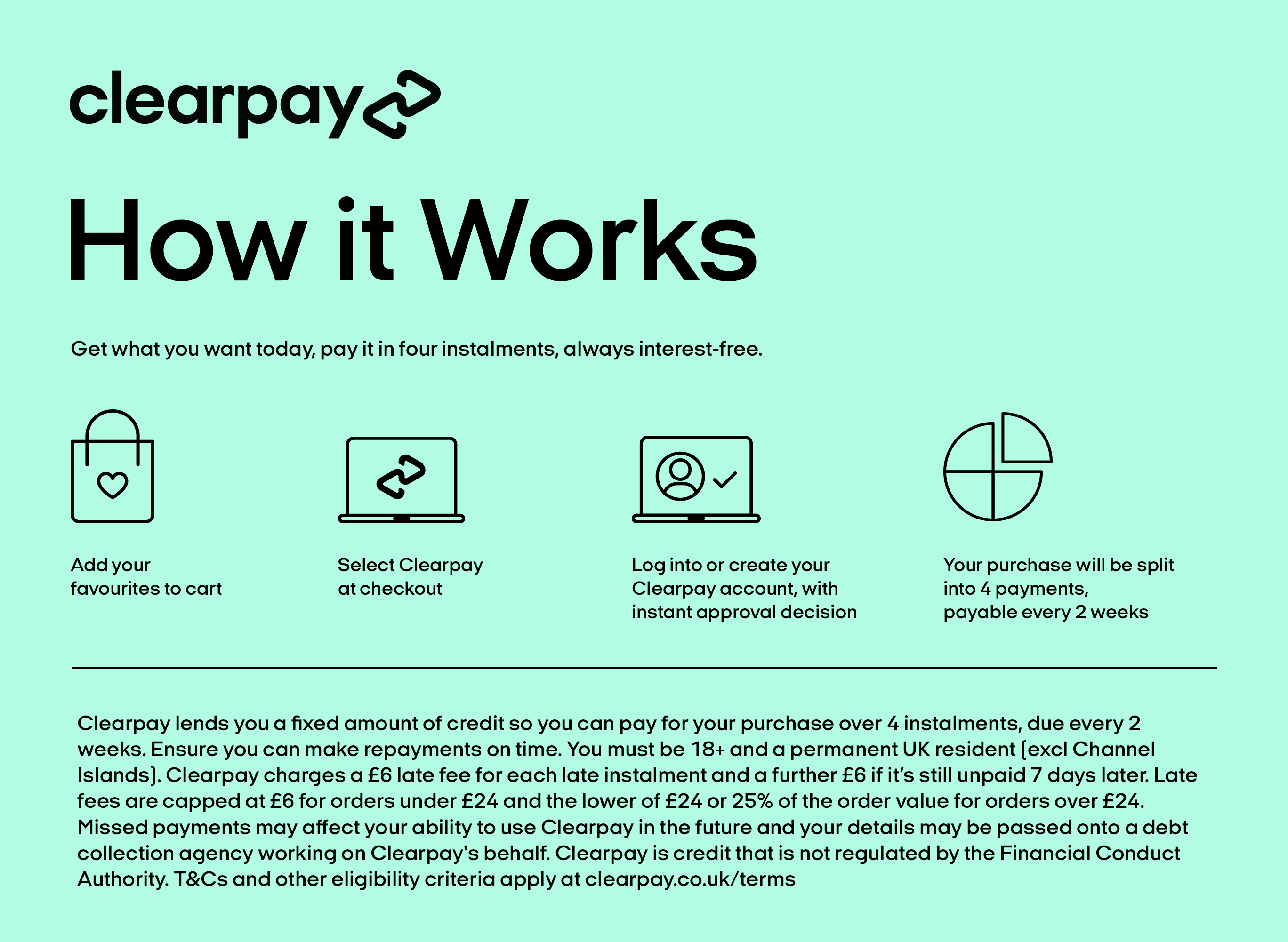Clearpay is a payment service that lends customers a fixed amount of credit to make purchases instantly and then pay for them in 4 automatic instalments, made every 2 weeks, without any interest (late fees apply). Please use Clearpay responsibly.