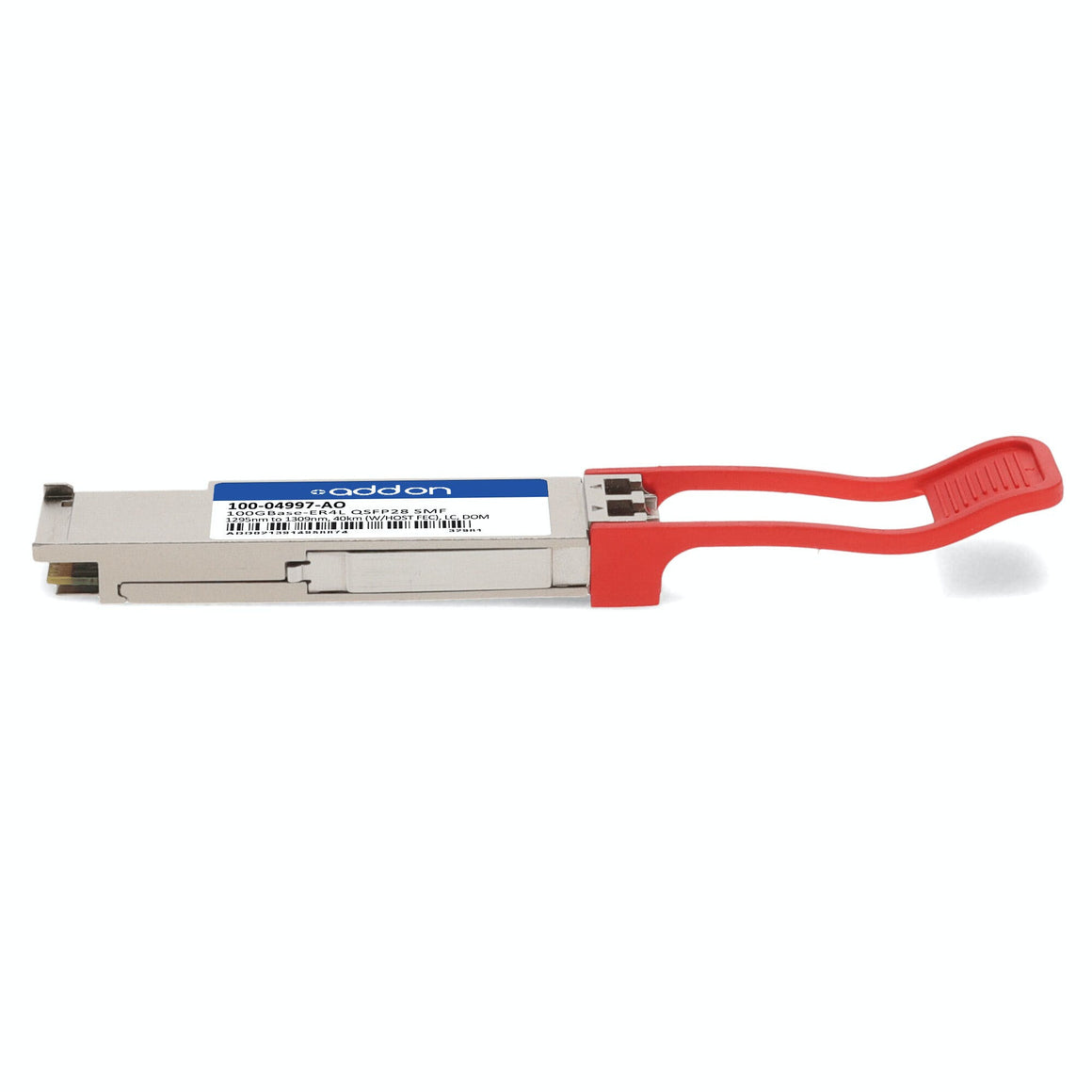 This Calix® 100-04997 compatible QSFP28 transceiver provides 100GBase-ER4 throughput up to 40km w/host FEC over single-mode fiber (SMF) using a wavelength of 1295nm to 1309nm via an LC connector. It is guaranteed to be 100% compatible with the equivalent Calix® transceiver. This easy to install, hot swappable transceiver has been programmed, uniquely serialized and data-traffic and application tested to ensure that it will initialize and perform identically. Digital optical monitoring (DOM) support is also present to allow access to real-time operating parameters. This transceiver is Trade Agreements Act (TAA) compliant. We stand behind the quality of our products and proudly offer a limited lifetime warranty.
