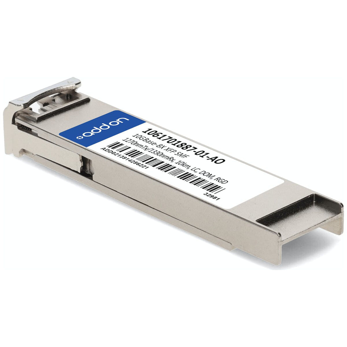 This ADVA® 1061701887-01 compatible SFP+ transceiver provides 10GBase-BX throughput up to 10km over single-mode fiber (SMF) using a wavelength of 1270nmTx/1330nmRx via an LC connector. This bidirectional unit must be used with another transceiver or network appliance of complimenting wavelengths. It can operate at temperatures between -40 and 85C. It is guaranteed to be 100% compatible with the equivalent ADVA® transceiver. This easy to install, hot swappable transceiver has been programmed, uniquely serialized and data-traffic and application tested to ensure that it will initialize and perform identically. Digital optical monitoring (DOM) support is also present to allow access to real-time operating parameters. This transceiver is Trade Agreements Act (TAA) compliant. We stand behind the quality of our products and proudly offer a limited lifetime warranty.