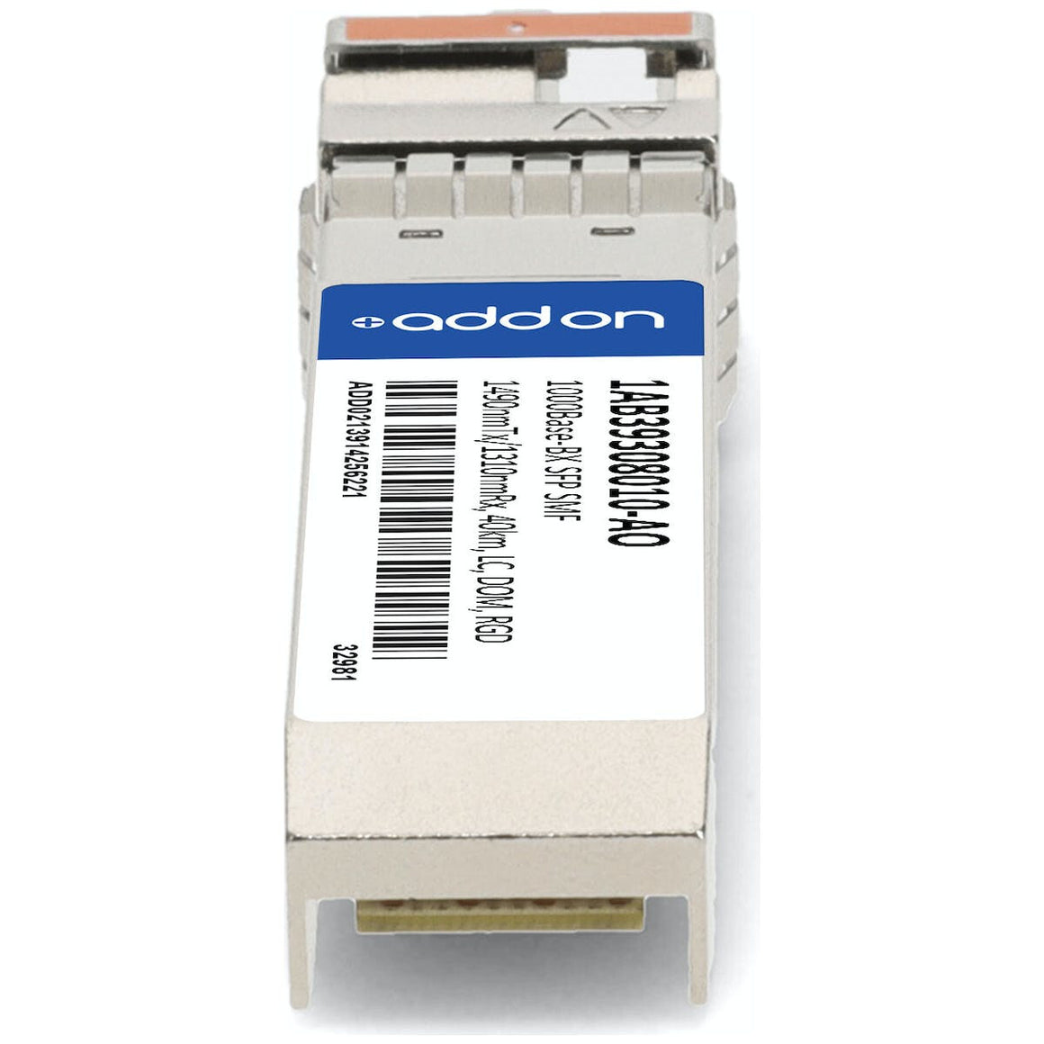 This Alcatel-Lucent Nokia® 1AB39308010 compatible SFP transceiver provides 1000Base-BX throughput up to 40km over single-mode fiber (SMF) using a wavelength of 1490nmTx/1310nmRx via an LC connector. This bidirectional unit must be used with another transceiver or network appliance of complementing wavelengths. It can operate at temperatures between -40 and 85C. It is guaranteed to be 100% compatible with the equivalent Alcatel-Lucent Nokia® transceiver. This easy to install, hot swappable transceiver has been programmed, uniquely serialized and data-traffic and application tested to ensure that it will initialize and perform identically. Digital optical monitoring (DOM) support is also present to allow access to real-time operating parameters. This transceiver is Trade Agreements Act (TAA) compliant. We stand behind the quality of our products and proudly offer a limited lifetime warranty.