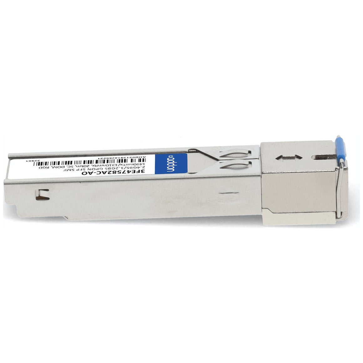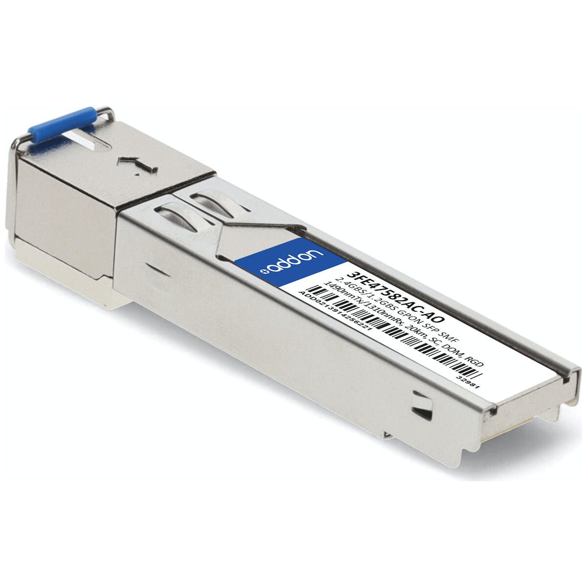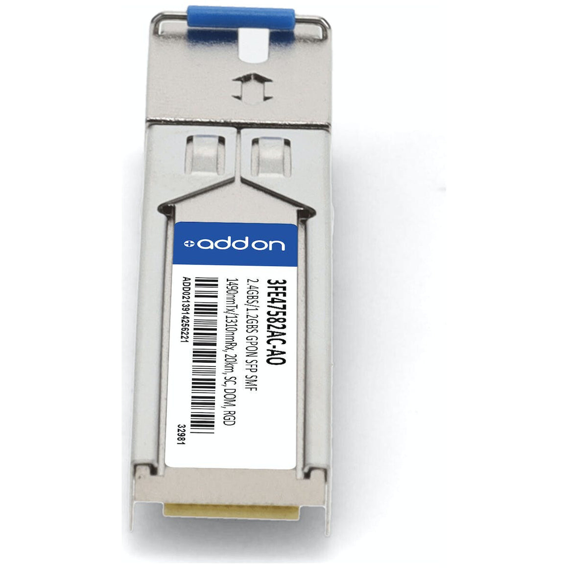 This Alcatel-Lucent Nokia® 3FE47582AC compatible SFP transceiver provides 2.4Gbs/1.2Gbs-B+ throughput up to 20km over single-mode fiber (SMF) using a wavelength of 1490nmTx/1310nmRx via a SC connector. It is also capable of withstanding rugged environments and can operate at temperatures between -40C to +85C. It is guaranteed to be 100% compatible with the equivalent Alcatel-Lucent Nokia® transceiver. This easy to install, hot swappable transceiver has been programmed, uniquely serialized and data-traffic and application tested to ensure that it will initialize and perform identically. It is built to meet or exceed the specifications of Alcatel-Lucent® Nokia®, as well as to comply with MSA (Multi-Source Agreement) standards to ensure seamless network integration. This transceiver is Trade Agreements Act (TAA) compliant. We stand behind the quality of our products and proudly offer a limited lifetime warranty.