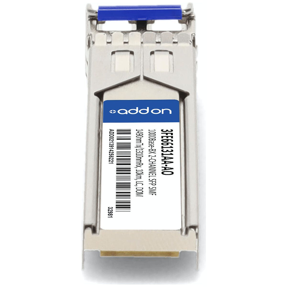 This Alcatel-Lucent Nokia® 3FE66131AA compatible SFP transceiver provides 1000Base-BX 2-Channel throughput up to 10km over single-mode fiber (SMF) using a wavelength of 1490nmTx/1310nmRx via an LC connector. It is guaranteed to be 100% compatible with the equivalent Alcatel-Lucent Nokia® transceiver. This easy to install, hot swappable transceiver has been programmed, uniquely serialized and data-traffic and application tested to ensure that it will initialize and perform identically. Digital optical monitoring (DOM) support is also present to allow access to real-time operating parameters. This transceiver is Trade Agreements Act (TAA) compliant. We stand behind the quality of our products and proudly offer a limited lifetime warranty.