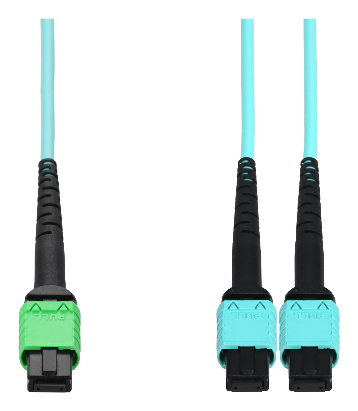 This is a 5m angled MPO (female) to 2xMPO (female) 12-strand aqua crossover polarity-B LSZH fiber patch cable. An OM4 cable has a core size of 50m microns that supports 10 Gigabit Ethernet at lengths measuring up to 550 meters, and 400 Gigabit Ethernet measuring up to 100 meters and is reverse compatible with OM3. This low smoke zero halogen cable reduces the amount of toxic and corrosive gas emitted during combustion. This type of material is typically used in poorly ventilated areas such as aircrafts, rail cars or ships and will self-extinguish. Our patch cables are 100% compliant for all of your networking needs. Our products are guaranteed by federal law to not affect or void OEM warranties.