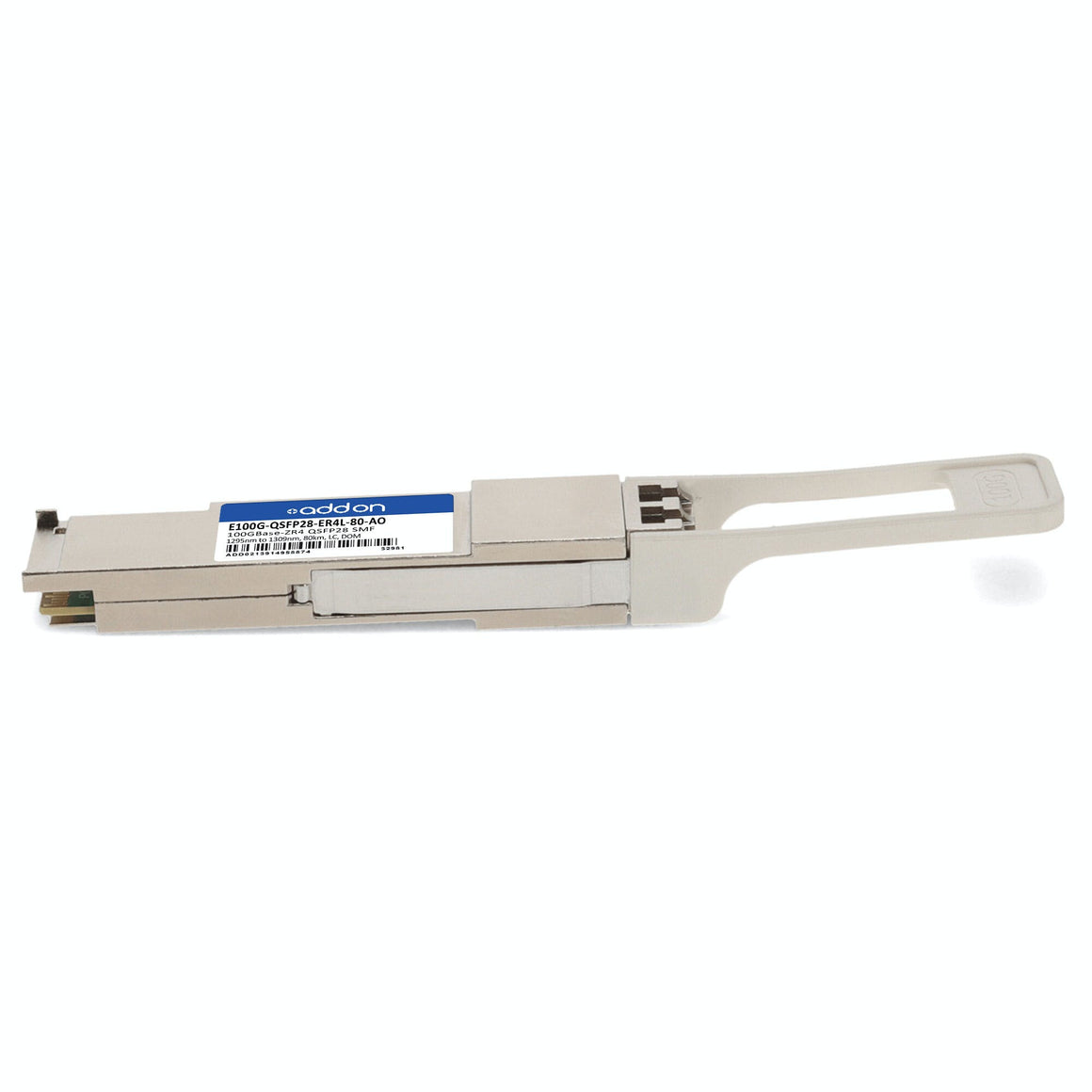 This Brocade® (Formerly) E100G-QSFP28-ER4L-80 compatible QSFP28 transceiver provides 100GBase-ZR4 throughput up to 80km over single-mode fiber (SMF) using a wavelength of 1295nm to 1309nm via an LC connector. It is guaranteed to be 100% compatible with the equivalent Brocade® (Formerly) transceiver. This easy to install, hot swappable transceiver has been programmed, uniquely serialized and data-traffic and application tested to ensure that it will initialize and perform identically. Digital optical monitoring (DOM) support is also present to allow access to real-time operating parameters. This transceiver is Trade Agreements Act (TAA) compliant. We stand behind the quality of our products and proudly offer a limited lifetime warranty.
