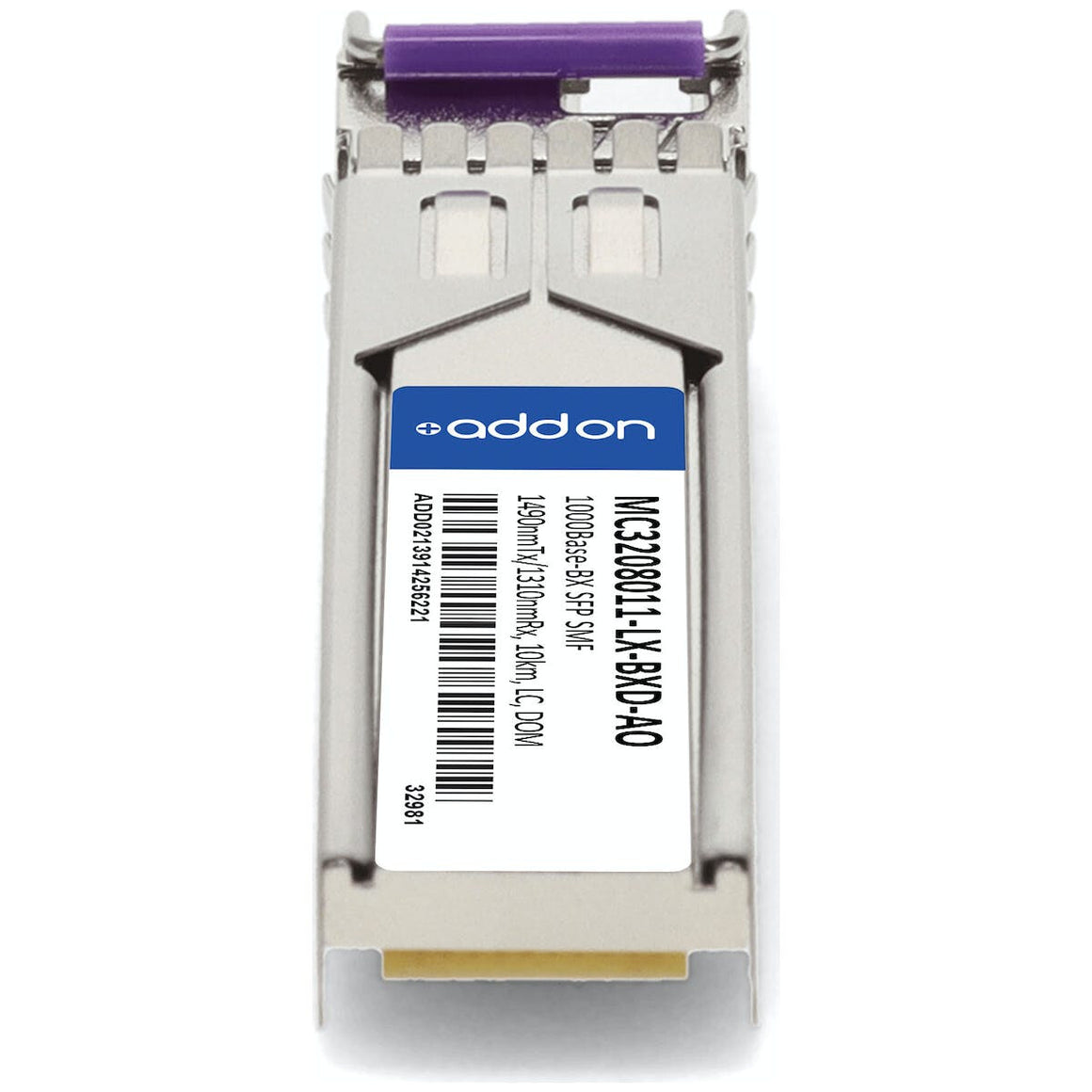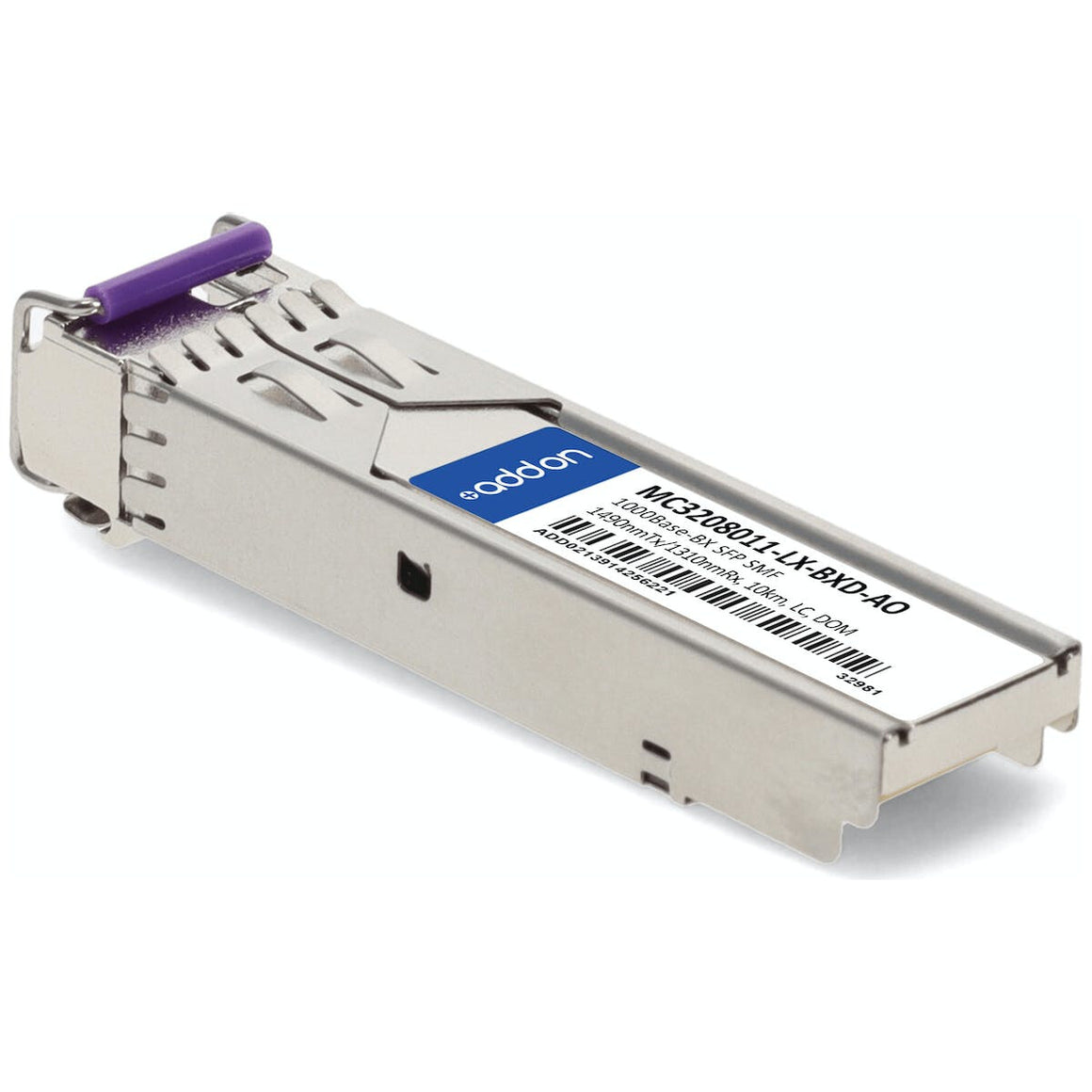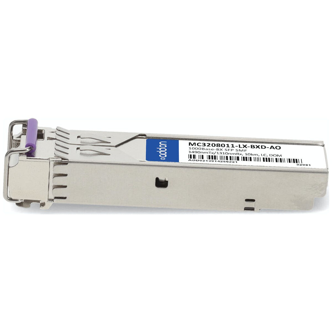 This Mellanox® MC3208011-LX-BXD compatible SFP transceiver provides 1000Base-BX throughput up to 10km over single-mode fiber (SMF) using a wavelength of 1490nmTx/1310nmRx via an LC connector. This bidirectional unit must be used with another transceiver or network appliance of complementing wavelengths. It is guaranteed to be 100% compatible with the equivalent Mellanox® transceiver. This easy to install, hot swappable transceiver has been programmed, uniquely serialized and data-traffic and application tested to ensure that it will initialize and perform identically. Digital optical monitoring (DOM) support is also present to allow access to real-time operating parameters. This transceiver is Trade Agreements Act (TAA) compliant. We stand behind the quality of our products and proudly offer a limited lifetime warranty.