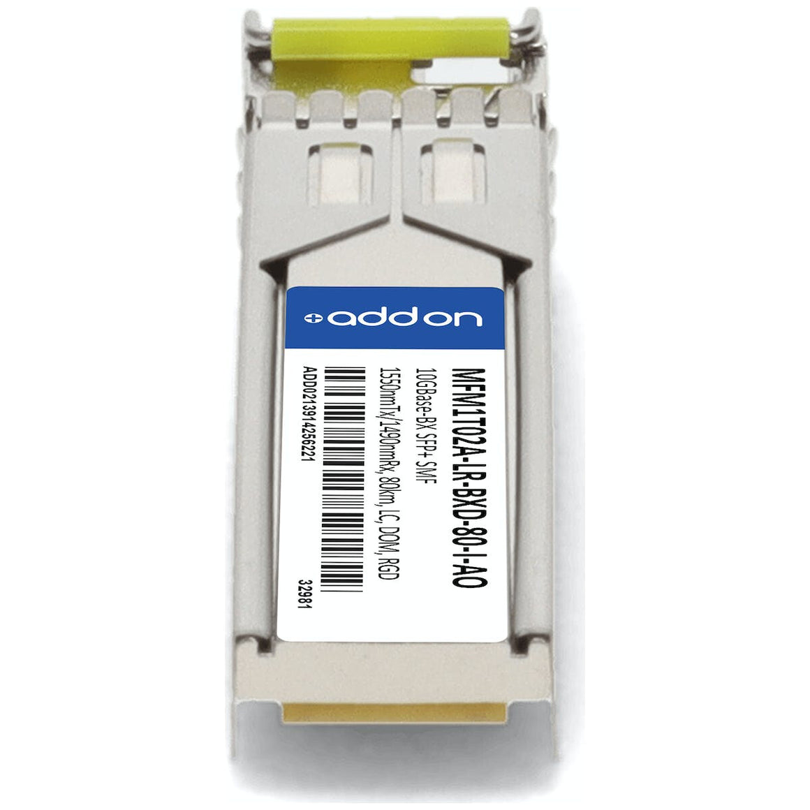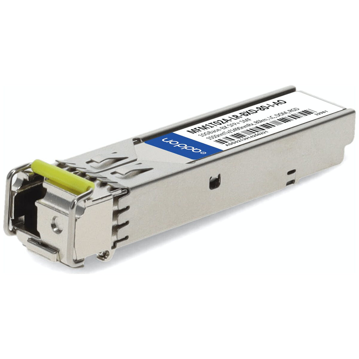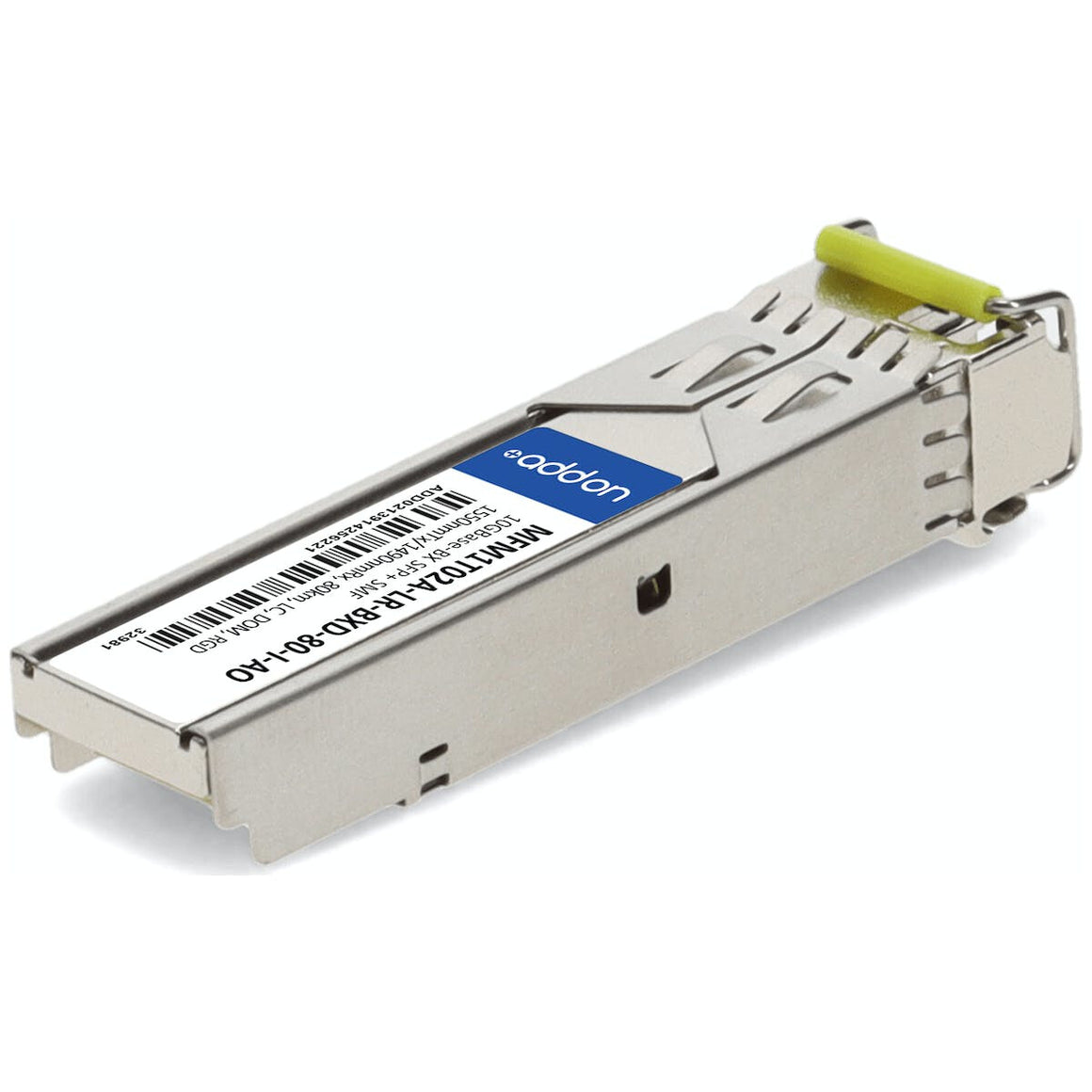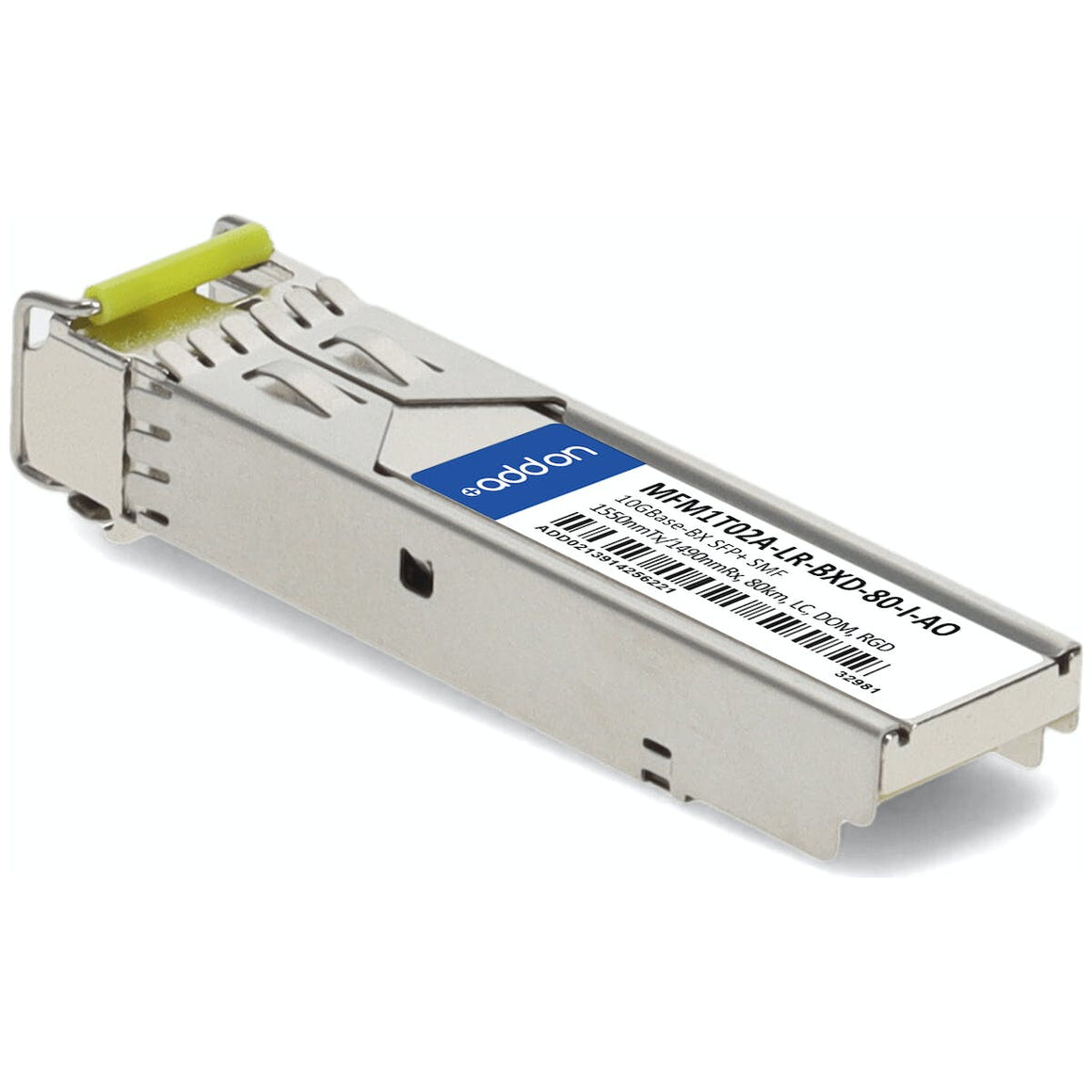 This Mellanox® MFM1T02A-LR-BXD-80-I compatible SFP+ transceiver provides 10GBase-BX throughput up to 80km over single-mode fiber (SMF) using a wavelength of 1550nmTx/1490nmRx via an LC connector. It can operate at temperatures between -40 and 85C. This bidirectional unit must be used with another transceiver or network appliance of complementing wavelengths. It is guaranteed to be 100% compatible with the equivalent Mellanox® transceiver. This easy to install, hot swappable transceiver has been programmed, uniquely serialized and data-traffic and application tested to ensure that it will initialize and perform identically. Digital optical monitoring (DOM) support is also present to allow access to real-time operating parameters. This transceiver is Trade Agreements Act (TAA) compliant. We stand behind the quality of our products and proudly offer a limited lifetime warranty.