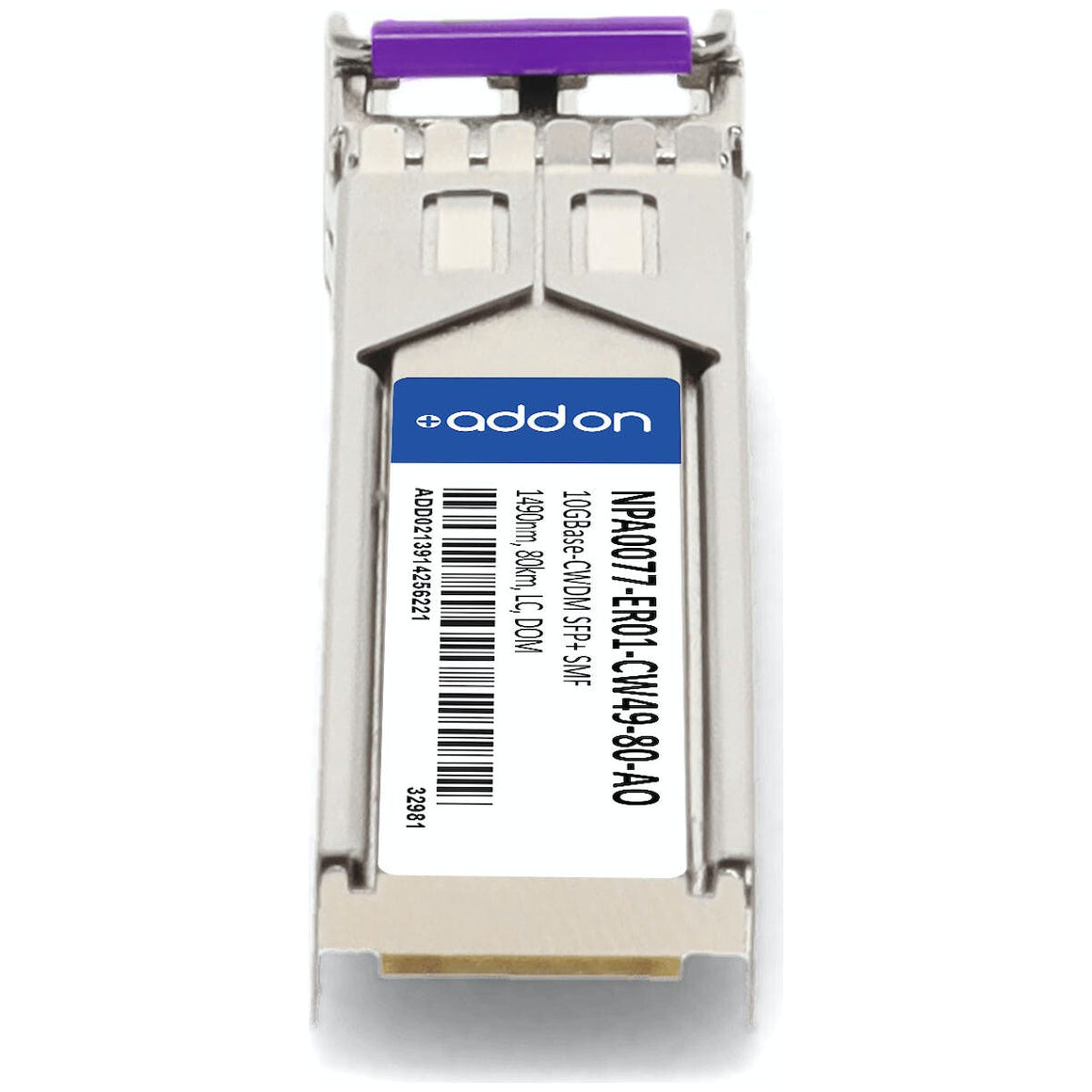 This Net Insight® NPA0077-ER01-CW49-80 compatible SFP+ transceiver provides 10GBase-CWDM throughput up to 80km over single-mode fiber (SMF) using a wavelength of 1490nm via an LC connector. It is guaranteed to be 100% compatible with the equivalent Net Insight® transceiver. This easy to install, hot swappable transceiver has been programmed, uniquely serialized and data-traffic and application tested to ensure that it will initialize and perform identically. Digital optical monitoring (DOM) support is also present to allow access to real-time operating parameters. This transceiver is Trade Agreements Act (TAA) compliant. We stand behind the quality of our products and proudly offer a limited lifetime warranty.