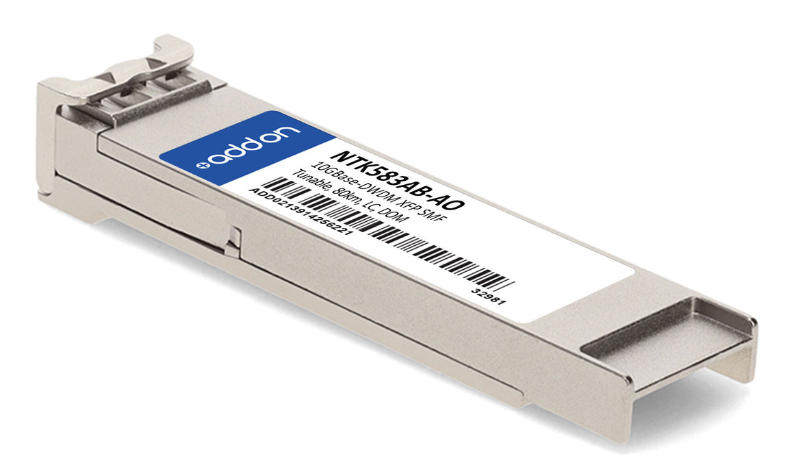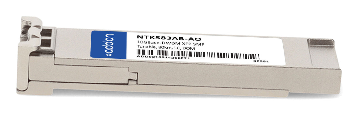 This Ciena® NTK583AB compatible XFP transceiver provides 10GBase-DWDM throughput up to 80km over single-mode fiber (SMF) using a wavelength of 1530nm to 1565nm via an LC connector. It is guaranteed to be 100% compatible with the equivalent Ciena® transceiver. This easy to install, hot swappable transceiver has been programmed, uniquely serialized and data-traffic and application tested to ensure that it will initialize and perform identically. Digital optical monitoring (DOM) support is also present to allow access to real-time operating parameters. This transceiver is Trade Agreements Act (TAA) compliant. We stand behind the quality of our products and proudly offer a limited lifetime warranty.