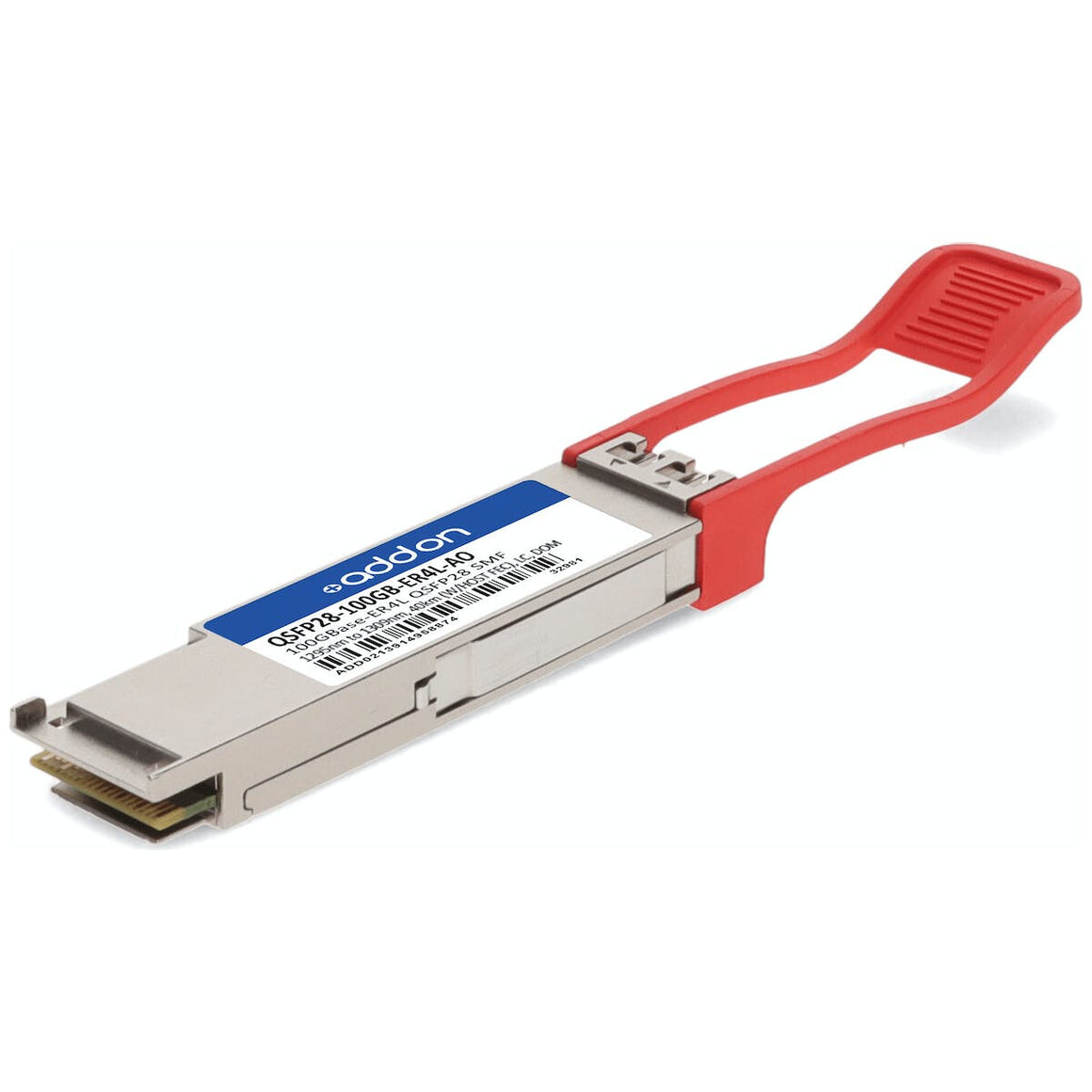 This MSA and TAA compliant QSFP28 transceiver provides 100GBase-ER4 throughput up to 40km w/host FEC over single-mode fiber (SMF) using a wavelength of 1295nm to 1309nm via an LC connector. It is guaranteed to be 100% compatible with the equivalent MSA compliant transceiver. This easy to install, hot swappable transceiver has been programmed, uniquely serialized and data-traffic and application tested to ensure that it will initialize and perform identically. Digital optical monitoring (DOM) support is also present to allow access to real-time operating parameters. This transceiver is Trade Agreements Act (TAA) compliant. We stand behind the quality of our products and proudly offer a limited lifetime warranty.