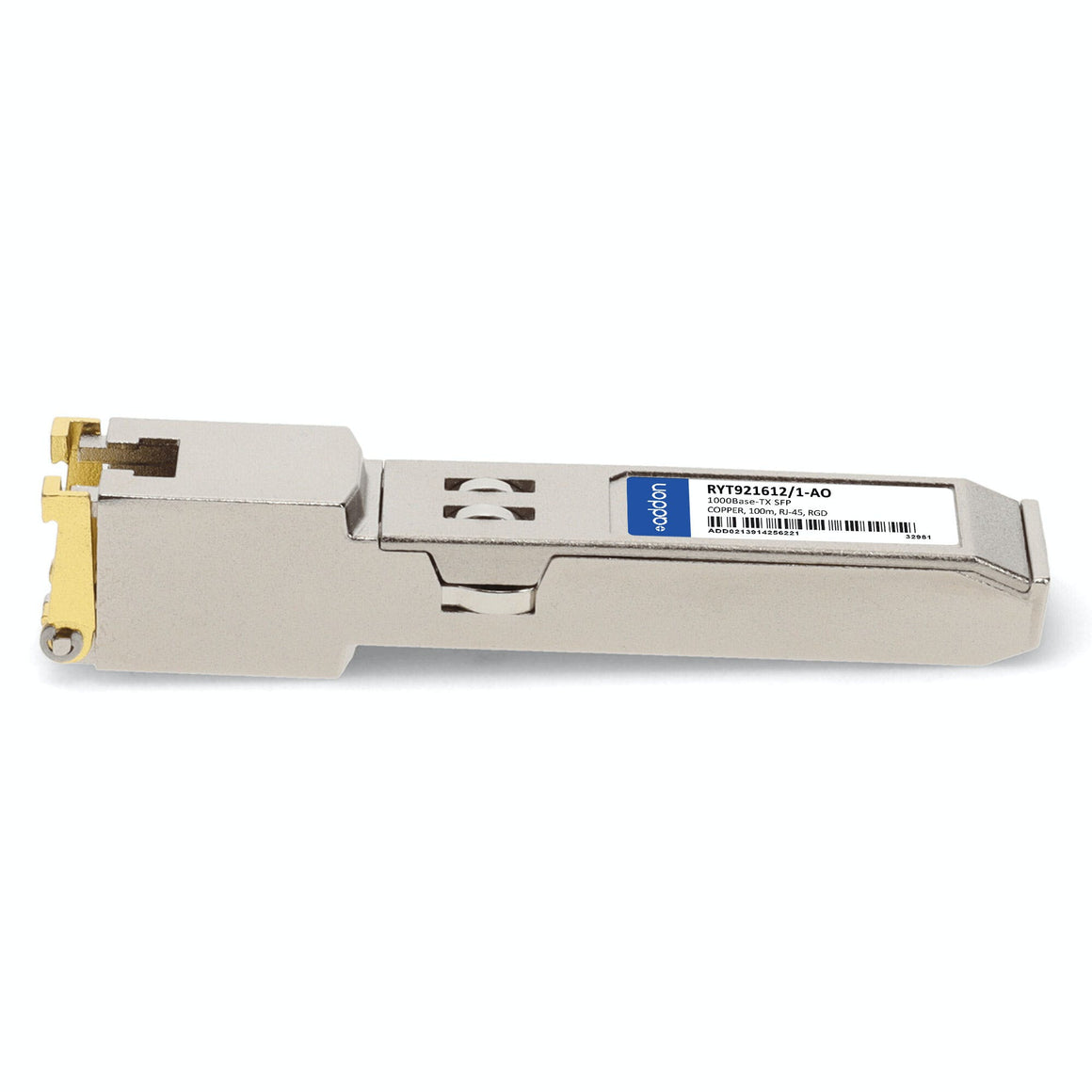 This LG-Ericsson® RYT921612/1 compatible SFP transceiver provides 10/100/1000Base-TX throughput up to 100m over a copper connection via a RJ-45 connector. It can operate at temperatures between -40 and 85C. This TX module supports 10/100/1000Base auto-negotiation and can be configured to fit your needs. It is guaranteed to be 100% compatible with the equivalent LG-Ericsson® transceiver. This easy to install, hot swappable transceiver has been programmed, uniquely serialized and data-traffic and application tested to ensure that it will initialize and perform identically. Digital optical monitoring (DOM) support is also present to allow access to real-time operating parameters. This transceiver is Trade Agreements Act (TAA) compliant. We stand behind the quality of our products and proudly offer a limited lifetime warranty.