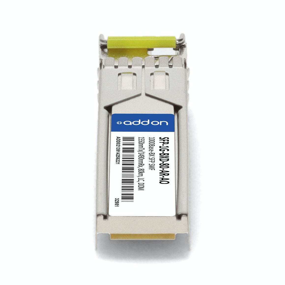 This Arista Networks® SFP-1G-BXD-80-AR compatible SFP transceiver provides 1000Base-BX throughput up to 80km over single-mode fiber (SMF) using a wavelength of 1550nmTx/1490nmRx via an LC connector. This bidirectional unit must be used with another transceiver or network appliance of complementing wavelengths. It can operate at temperatures between 0 and 70C. Our transceiver is built to meet or exceed OEM specifications and is guaranteed to be 100% compatible with Arista Networks®. It has been programmed, uniquely serialized, and tested for data-traffic and application to ensure that it will initialize and perform identically. All of our transceivers comply with Multi-Source Agreement (MSA) standards to provide seamless network integration. Additional product features include Digital Optical Monitoring (DOM) support which allows access to real-time operating parameters. We stand behind the quality of our products and proudly offer a limited lifetime warranty.