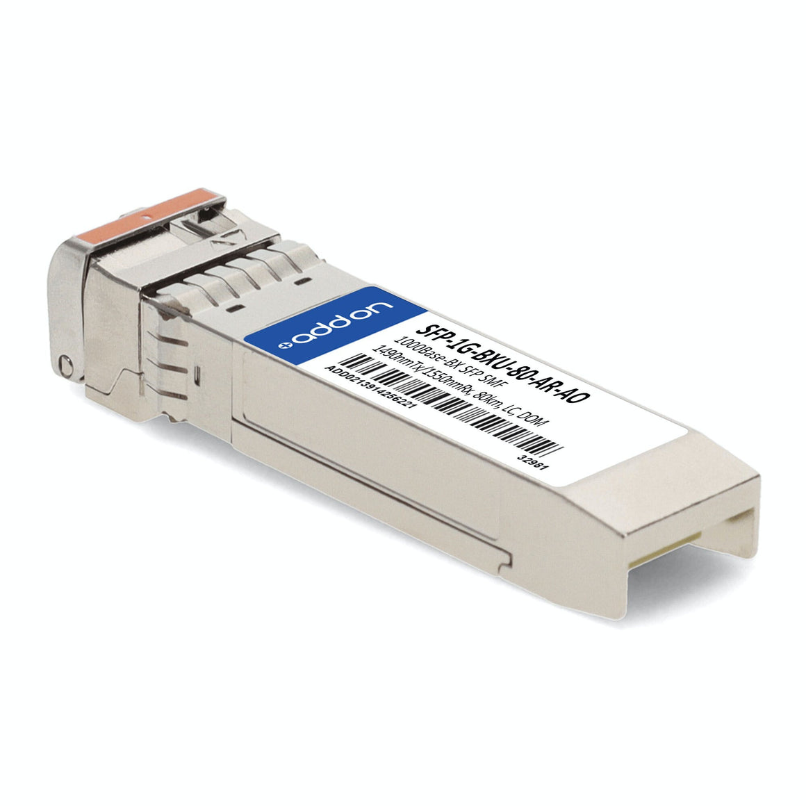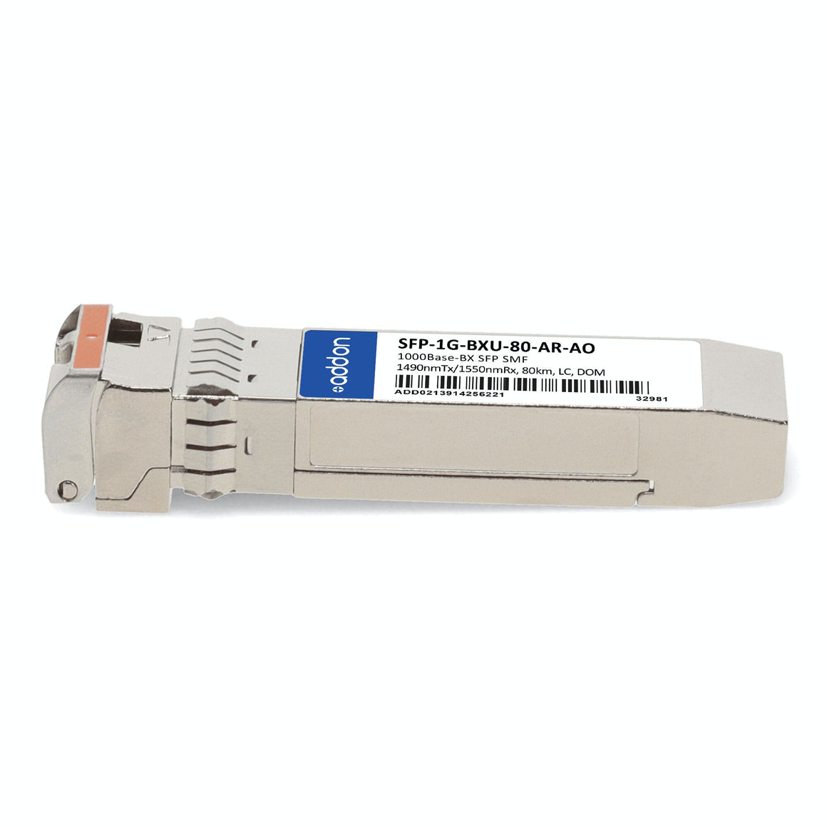 This Arista Networks® SFP-1G-BXU-80-AR compatible SFP transceiver provides 1000Base-BX throughput up to 80km over single-mode fiber (SMF) using a wavelength of 1490nmTx/1550nmRx via an LC connector. This bidirectional unit must be used with another transceiver or network appliance of complementing wavelengths. It can operate at temperatures between 0 and 70C. Our transceiver is built to meet or exceed OEM specifications and is guaranteed to be 100% compatible with Arista Networks®. It has been programmed, uniquely serialized, and tested for data-traffic and application to ensure that it will initialize and perform identically. All of our transceivers comply with Multi-Source Agreement (MSA) standards to provide seamless network integration. Additional product features include Digital Optical Monitoring (DOM) support which allows access to real-time operating parameters. We stand behind the quality of our products and proudly offer a limited lifetime warranty.