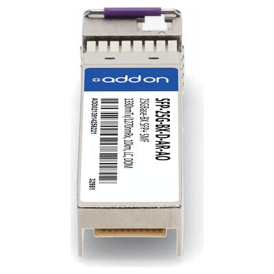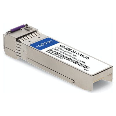 This Arista Networks® SFP-25G-BX-D-AR compatible SFP+ transceiver provides 25GBase-BX throughput up to 10km over single-mode fiber (SMF) using a wavelength of 1330nmTx/1270nmRx via an LC connector. This bidirectional unit must be used with another transceiver or network appliance of complementing wavelengths. It is guaranteed to be 100% compatible with the equivalent Arista Networks® transceiver. This easy to install, hot swappable transceiver has been programmed, uniquely serialized and data-traffic and application tested to ensure that it will initialize and perform identically. Digital optical monitoring (DOM) support is also present to allow access to real-time operating parameters. This transceiver is Trade Agreements Act (TAA) compliant. We stand behind the quality of our products and proudly offer a limited lifetime warranty.