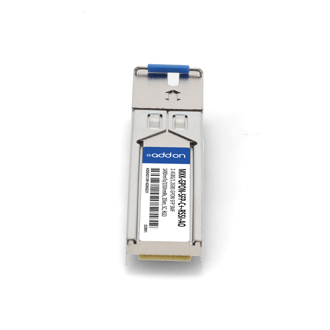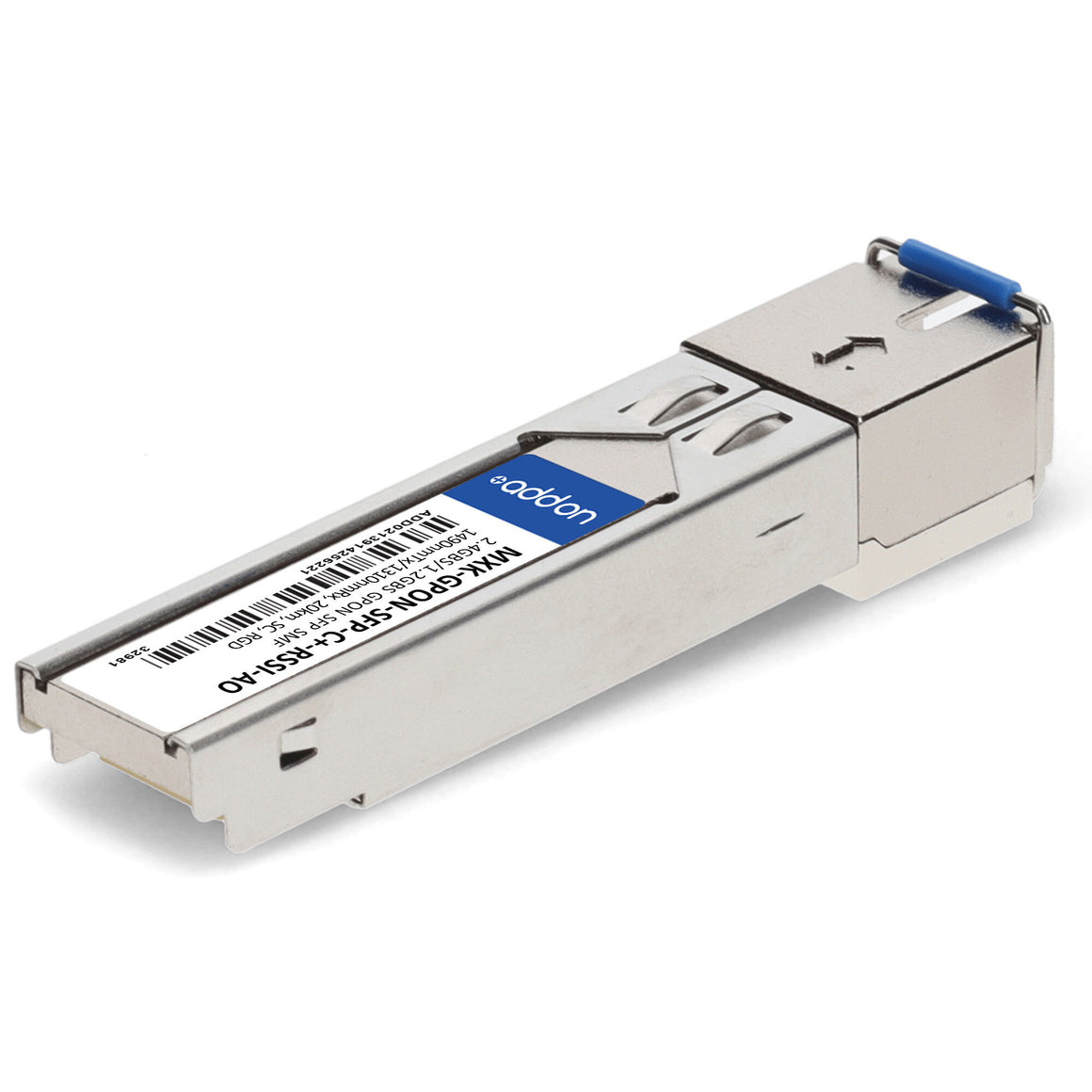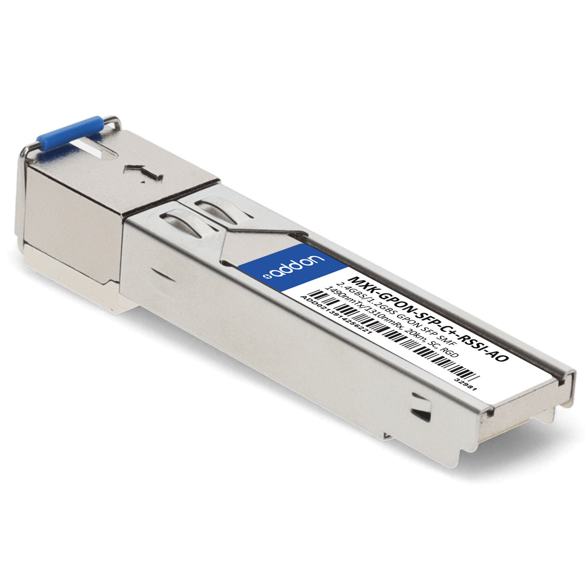 This Zhone® MXK-GPON-SFP-C+-RSSI compatible SFP transceiver provides 2.4Gbs/1.2Gbs-C+ throughput up to 20km over single-mode fiber (SMF) using a wavelength of 1490nmTx/1310nmRx via a SC connector. It is guaranteed to be 100% compatible with the equivalent Zhone® transceiver. This easy to install, hot swappable transceiver has been programmed, uniquely serialized and data-traffic and application tested to ensure that it will initialize and perform identically. It is built to meet or exceed the specifications of Zhone®, as well as to comply with MSA (Multi-Source Agreement) standards to ensure seamless network integration. This transceiver is Trade Agreements Act (TAA) compliant.