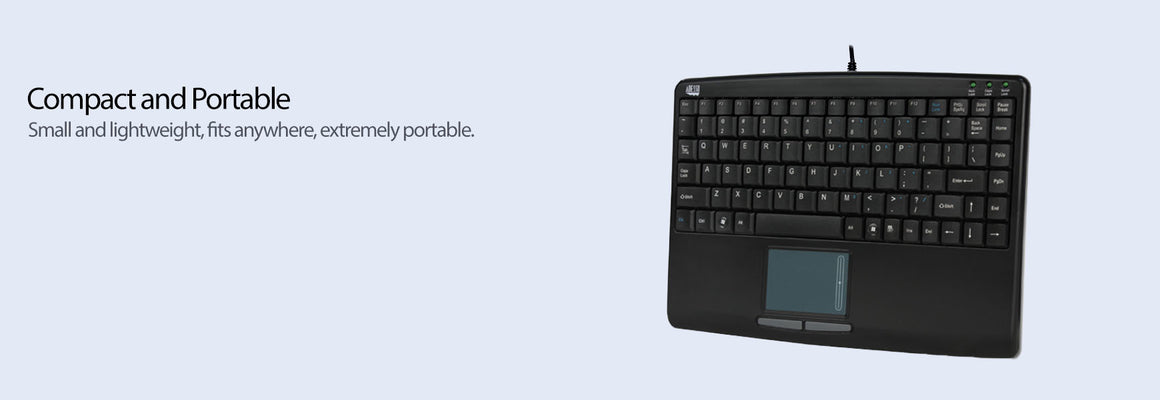The Adesso Slim Touch Mini Keyboard combines the control of an integrated touchpad with the features of a standard keyboard to provide a small, yet powerful input device. The touchpad includes a scrolling area that scrolls up and down for faster browsing. The Adesso SlimTouch Mini Keyboard is perfect and ideal for slim line PCs, notebooks, POS stations, kiosks and wherever there is little space, its suitable where several keyboards are in use at the same time.