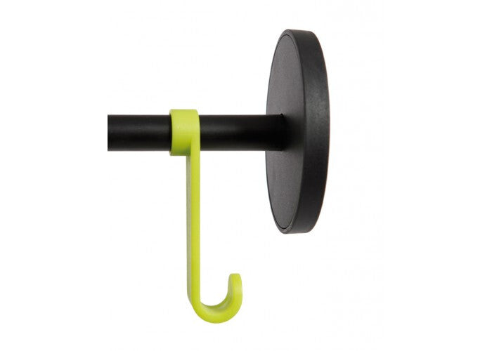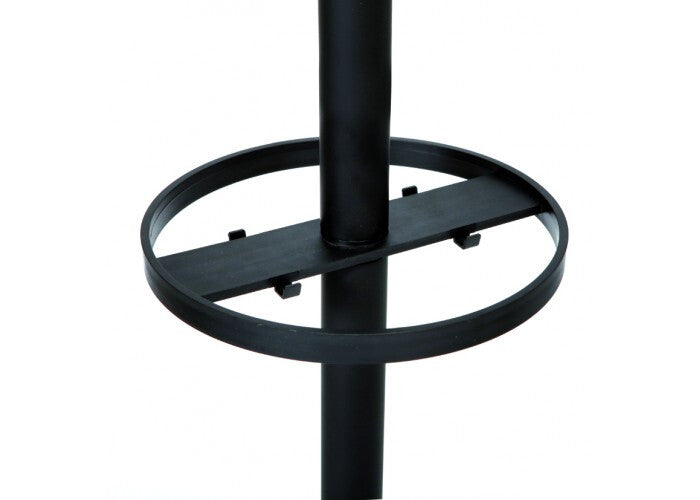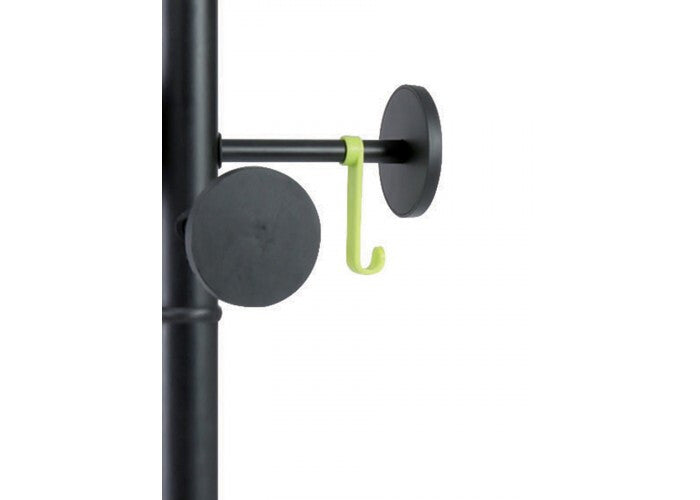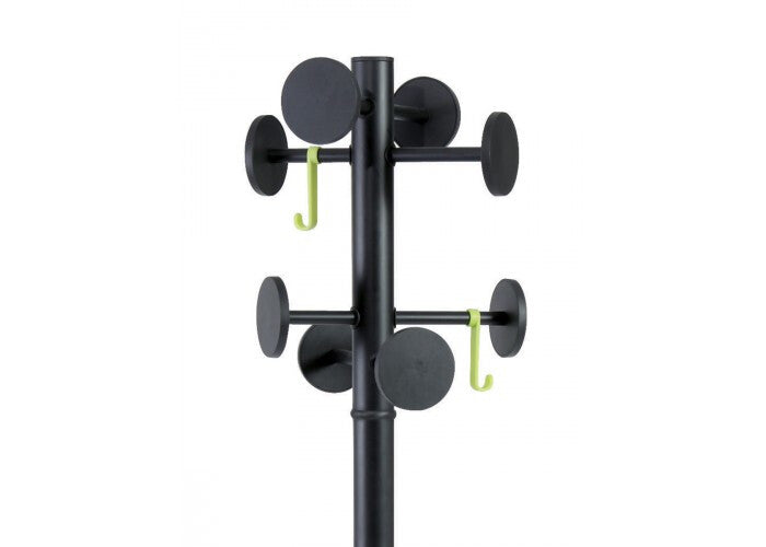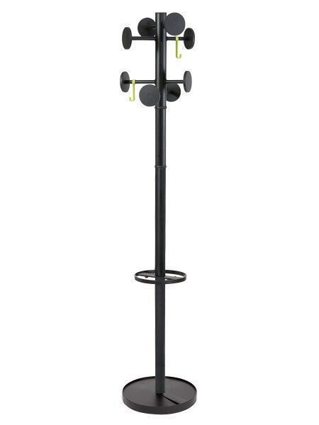 Stylish black coat stand with great capacity thanks to 8 rounded plastic coat pegs, an umbrella holder, two removable hooks for accessories.