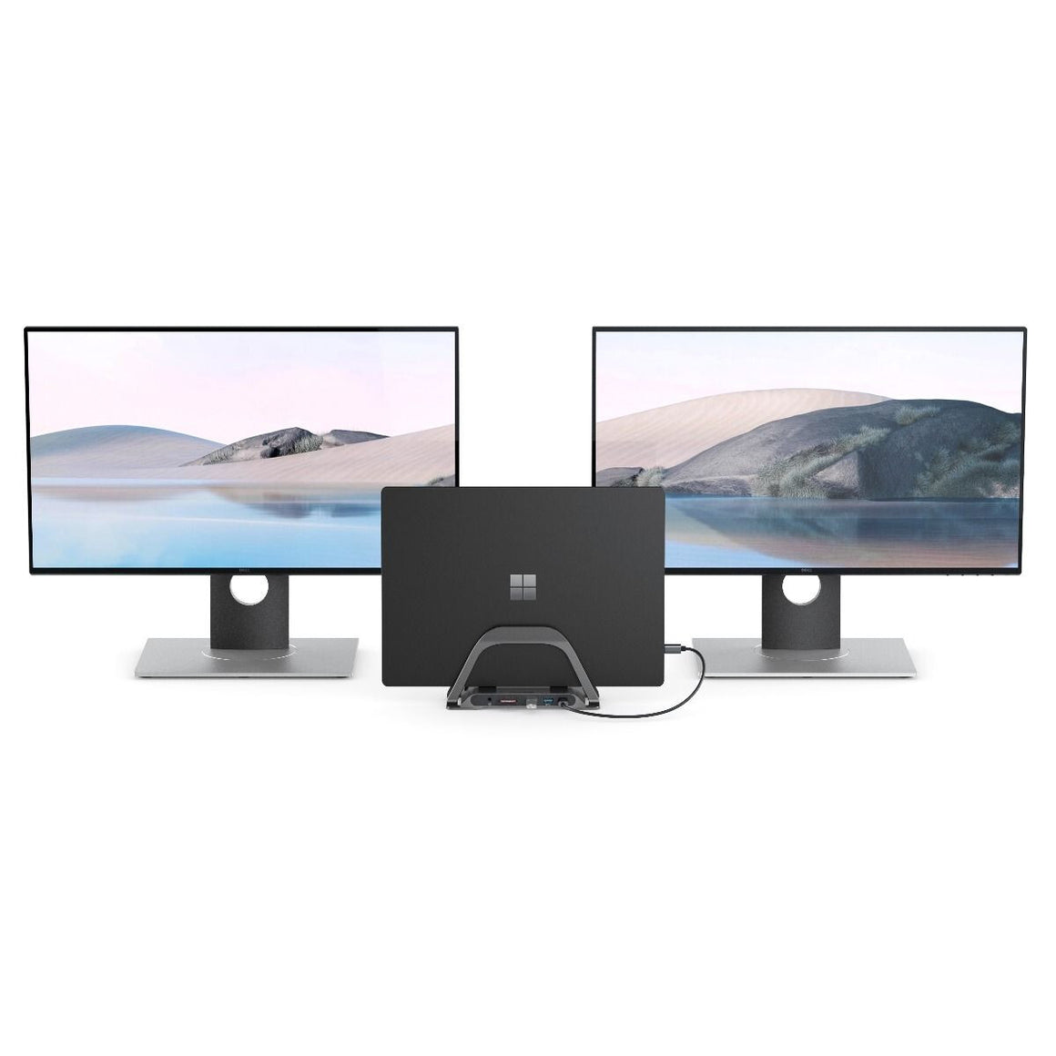 The 10-in-1 dock can support up to two external displays connected to the 2 x HDMI outputs*. The dock supports extension or mirroring across the three external displays when used with a Windows Laptop or MacBook device.