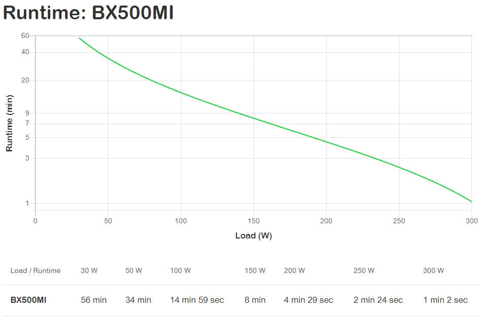 | Audible alarm modes | Alarm when on battery, Low battery alarm |