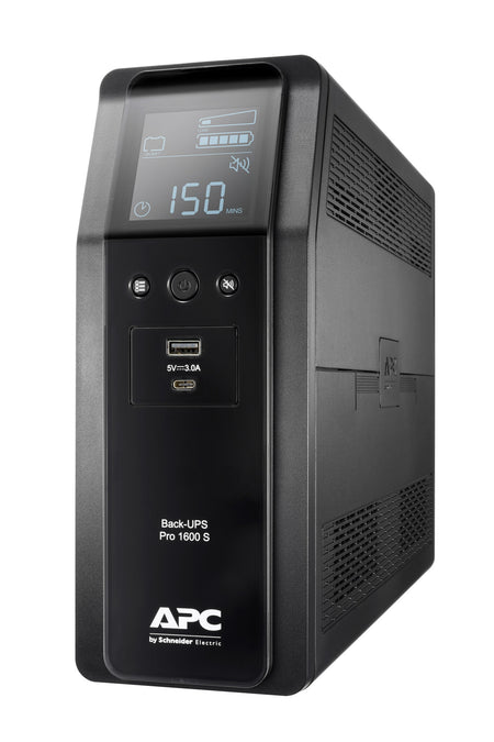 This APC Back-UPS Pro offers premium power protection for high performance computer systems, routers/modems, external storage devices, game consoles and other electronics in your home or business. The 1600VA tower UPS has 8 total outlets, 6 of which are battery back up and surge protection, and 2 that are surge protection only. It has a surge energy rating of 509 Joules. It has 2 USB ports (Type A + C) for smart charging of personal devices. Its runtime at 100 Watts is 1 hour 18 minutes. Its dimensions are 26 x 10 x 36.8 cm and 12.1 kg. The Back-UPS Pro family offers guaranteed power protection for high-performance computer systems, routers, external storage devices, game consoles, and other home and business electronics. This UPS has a 2-year warranty and CE product certification. It is compatible with a dedicated user-replaceable battery, and the APC replacement battery cartridge helps restore UPS performance to the original specifications.