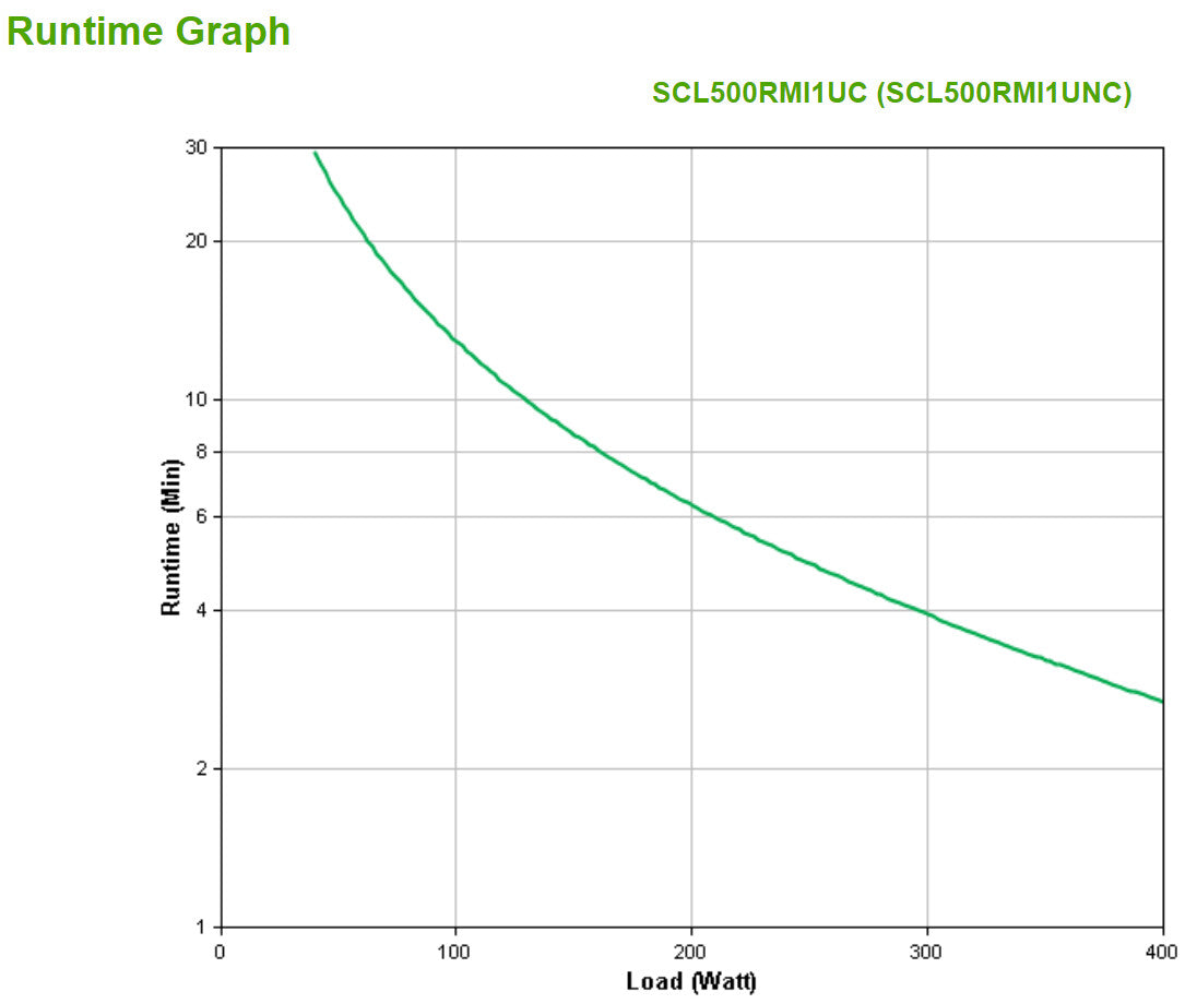 You can easily read the expected battery life in the runtime graph, which you can find between the product images. You can easily see how long the UPS supplies emergency power at a certain load.