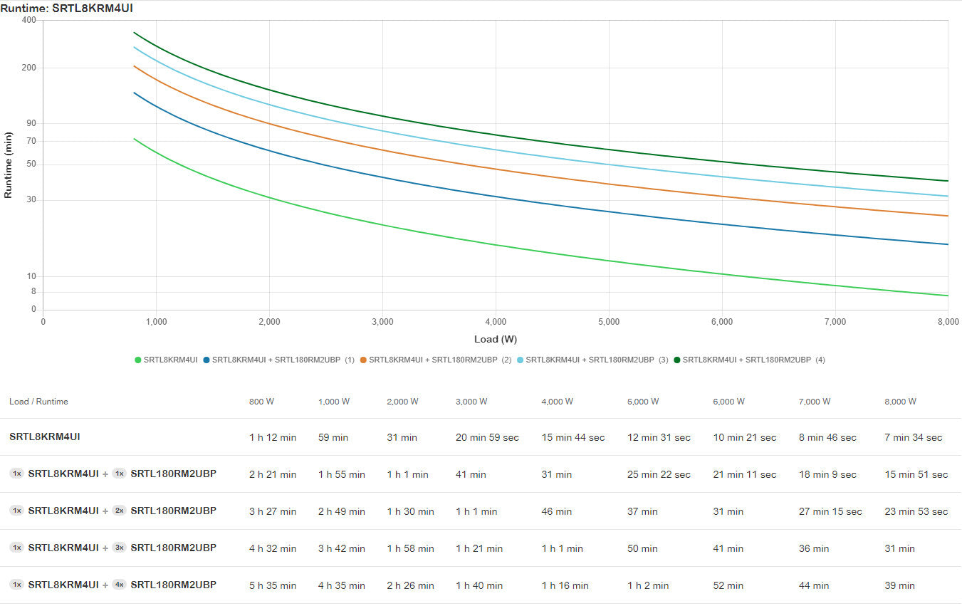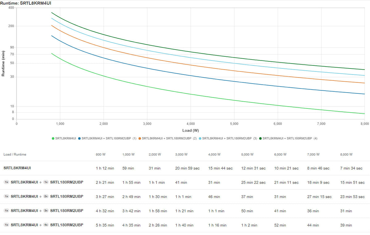 You can easily read the expected battery life in the runtime graph, which you can find between the product images. You can easily see how long the UPS supplies emergency power at a certain load.