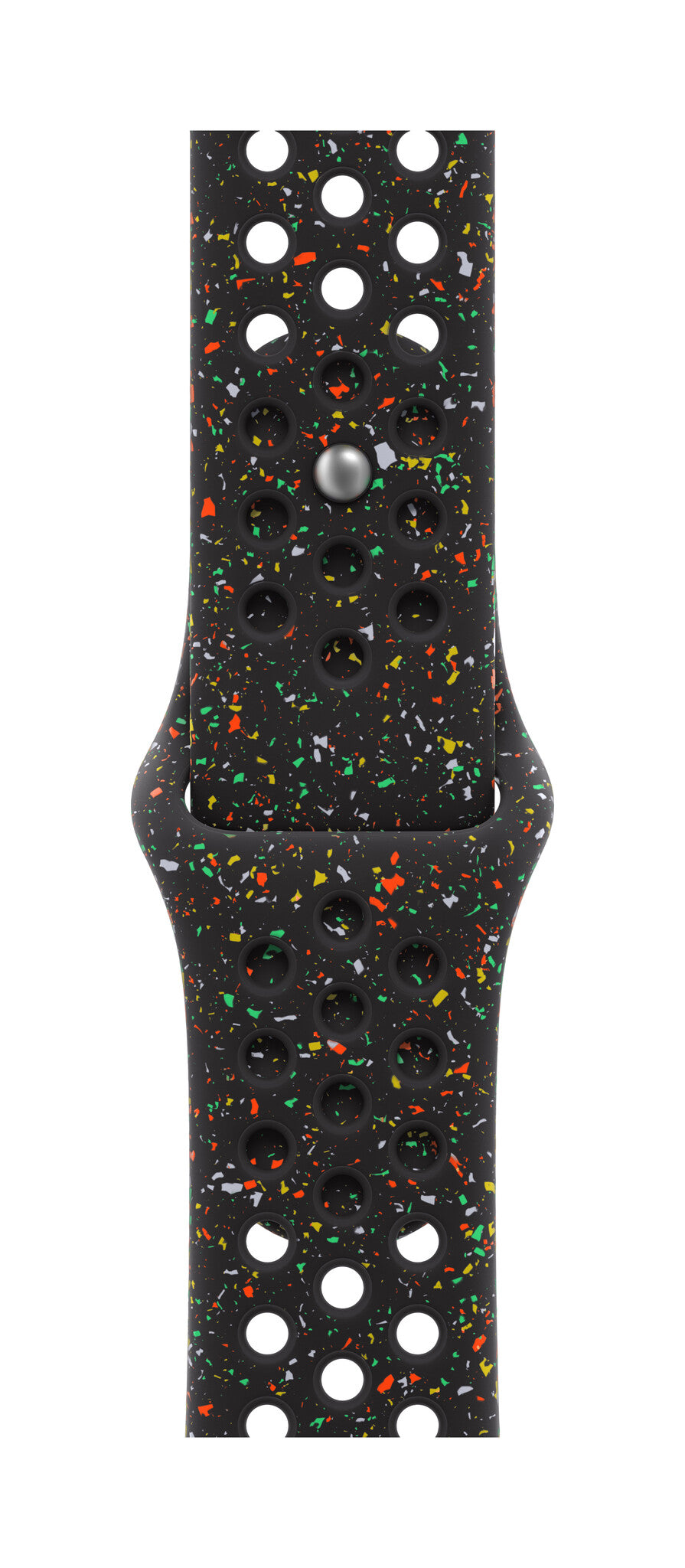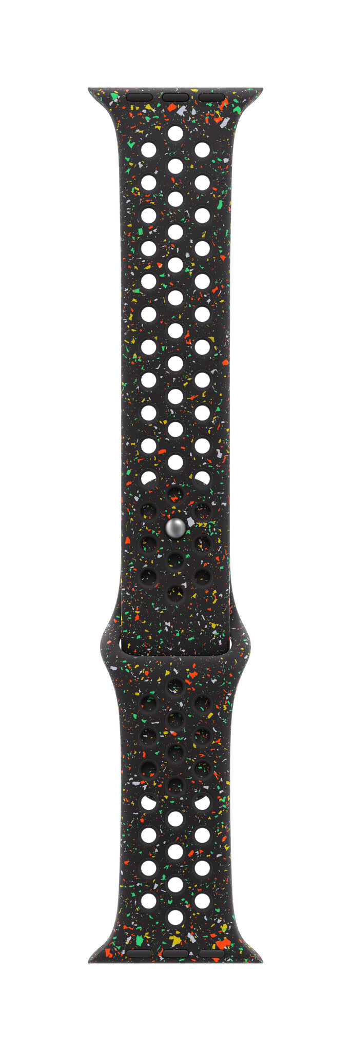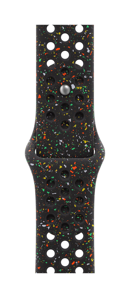 Made with compression-moulded perforations for breathability, the Nike Sport Band is durable and strong, yet surprisingly soft. It features colourful flakes that create a randomised pattern, making each strap unique. The smooth, dense material drapes elegantly across your wrist and feels comfortable next to your skin. An aluminium pin-and-tuck closure — carefully etched with the Run Swoosh logo — gives the pin a fresh matt finish.