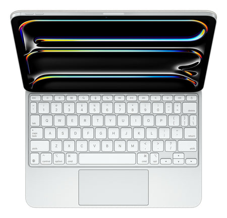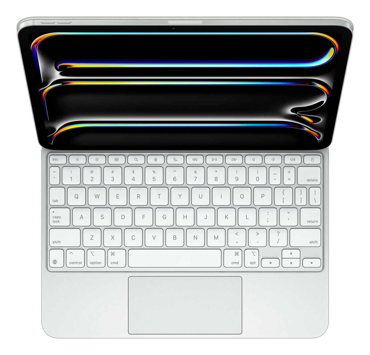 Magic Keyboard for iPad Pro delivers an amazing typing and trackpad experience in a sleek, portable new design with an aluminum palm rest. The keyboard includes a 14-key function row for quick access to screen brightness, volume controls, and other features, and a USB‑C connector for pass-through charging. The floating cantilever design smoothly adjusts to multiple viewing angles.