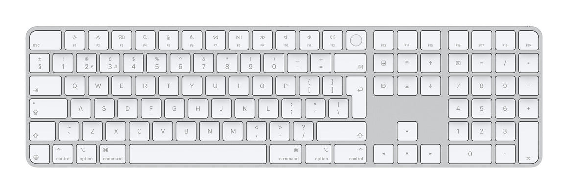 Magic Keyboard with Touch ID and Numeric Keypad delivers a remarkably comfortable and precise typing experience. It features an extended layout, with document navigation controls for quick scrolling and full-size arrow keys, which are great for gaming. The numeric keypad is also ideal for spreadsheets and finance applications. It’s wireless and features a rechargeable battery that will power your keyboard for about a month or more between charges. It pairs automatically with your Mac, so you can get to work straightaway.