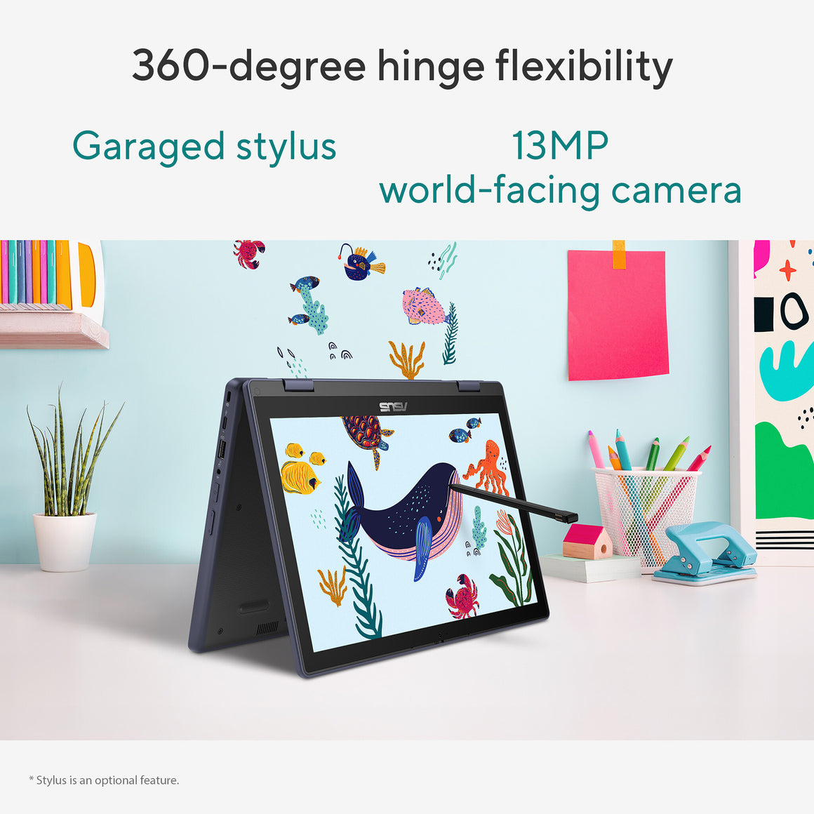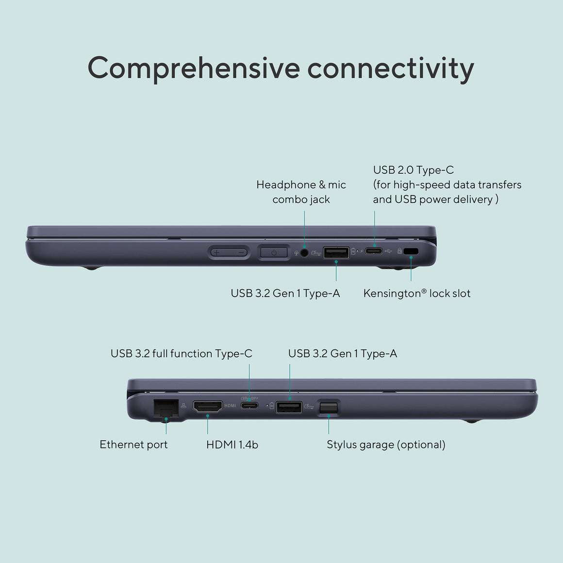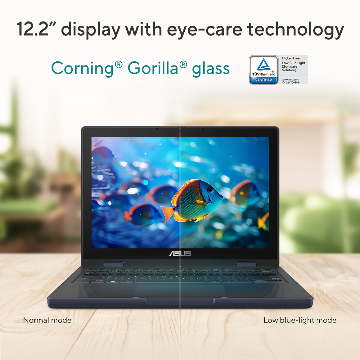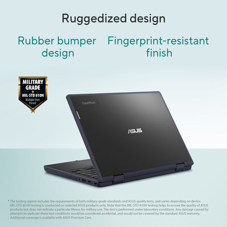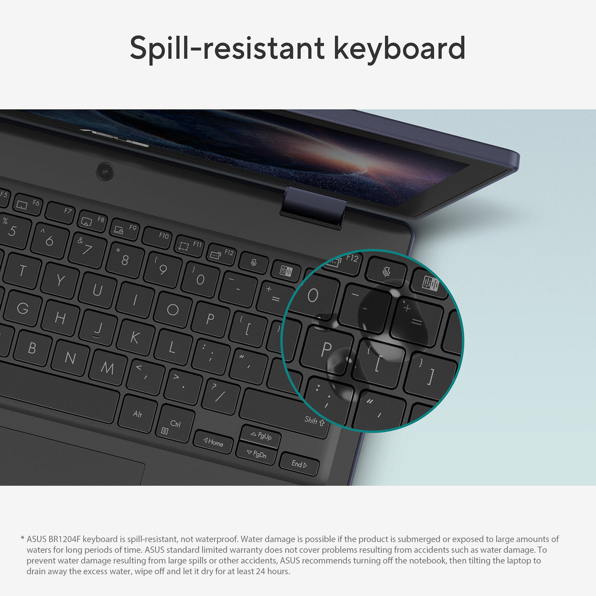 ASUS BR1204F stands out as an excellent tool for limitless learning in K-12 education, boasting a durable fingerprint-resistant finish and robust modular design that incorporates and replaceable internal components, thereby extending its product lifespan. Smartly crafted to withstand accidental drops, ASUS BR1204F undergoes rigorous testing, meeting US military-grade standards1 and exacting in-house ASUS assessments to ensure unwavering durability — making it the perfect choice for modern education.