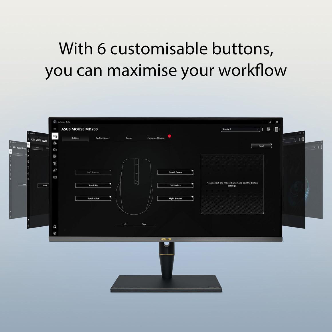 ASUS SmartO Mouse includes intuitive software that allows you to customize the way it works and monitor vital statistics, such as battery life, DPI and polling rate. With six customizable buttons, you can configure ASUS SmartO Mouse to maximize your workflow, and easily make tracking accuracy and polling-rate adjustments in the software functions page.