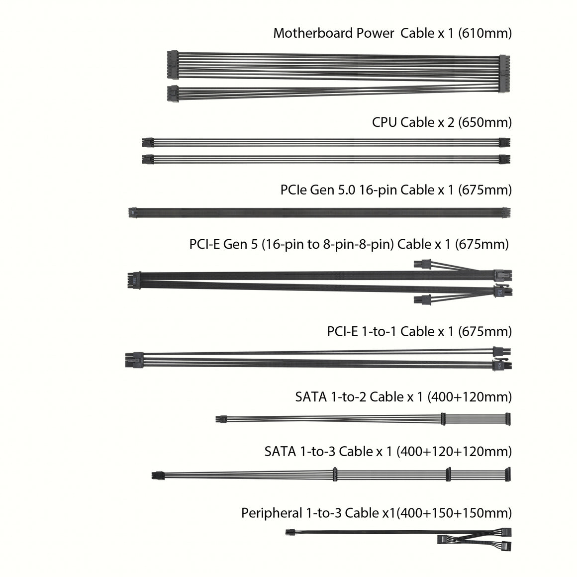 AC, CPU, PCIe, Peripheral (Molex), SATA |