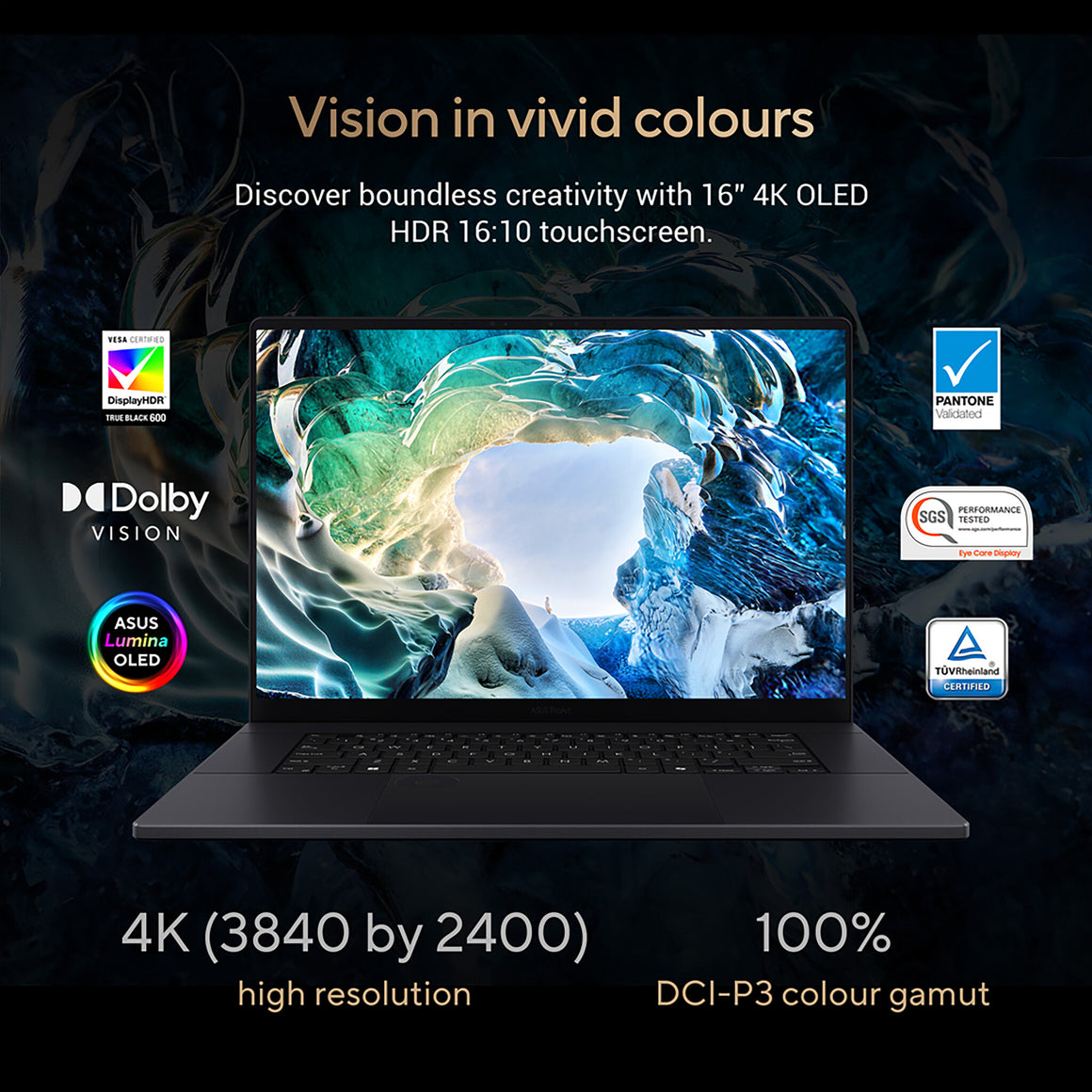 Meet ProArt P16 – your ultimate creative companion for the studio and on the move. Its OLED touchscreen ensures precise colour accuracy for flawless proofing, while versatile I/O ports seamlessly connect all your peripherals. This NVIDIA® Studio-validated laptop packs a GeForce RTX™ 40 Series Laptop GPU, providing powerful graphics and AI performance. Additionally, it features an up to 50 TOPS AMD Ryzen™ AI 9 HX 370, delivering exceptional processing power. With AI-enhanced creative features, military-grade toughness, and a long-lasting battery, ProArt P16 transforms any setting into your studio.