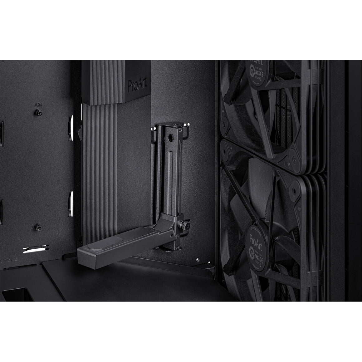 The ProArt PA602 supports one 420 mm radiator for AIO cooling or custom liquid-cooling loops. It also provides sufficient space for the beefiest graphics cards in both horizontal and vertical mounting positions.