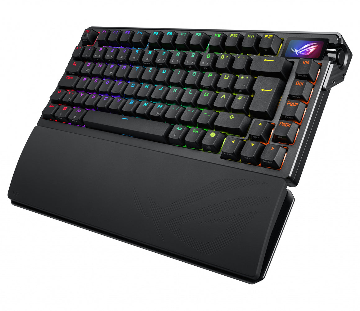 The ROG Azoth Extreme is a customizable 75% gaming keyboard with a premium aluminum-alloy chassis and metal frame. It features an 8000 Hz report rate with the ROG Polling Rate Booster and over 1600 hours of battery life in ROG SpeedNova 2.4 GHz wireless mode. The upgraded OLED touchscreen and three-way knob enable system monitoring and quick adjustments. The carbon-fiber positioning plate ensures a crisp typing sound, while three dampening layers absorb vibrations. An adjustable gasket mount with a paddle switch offers two typing preferences.