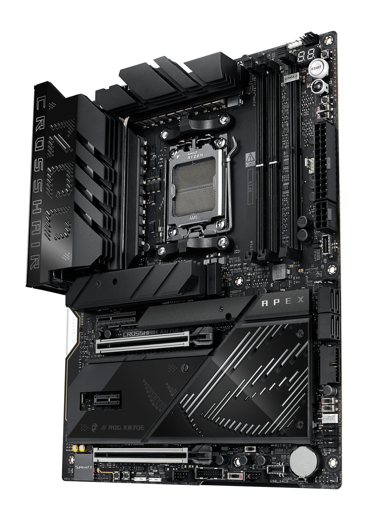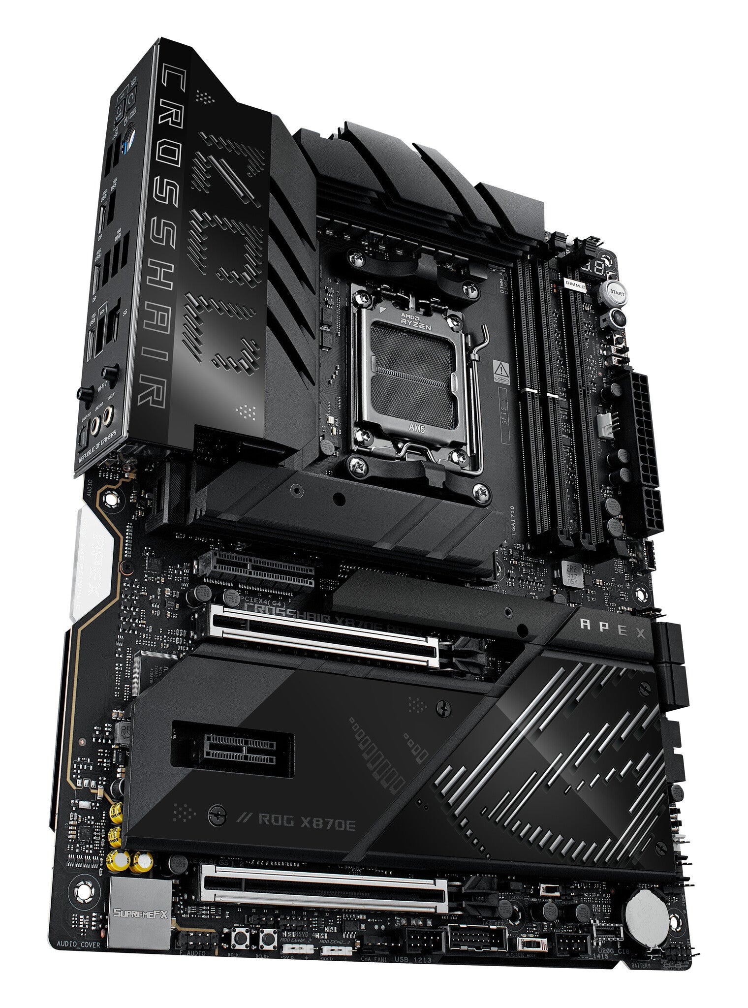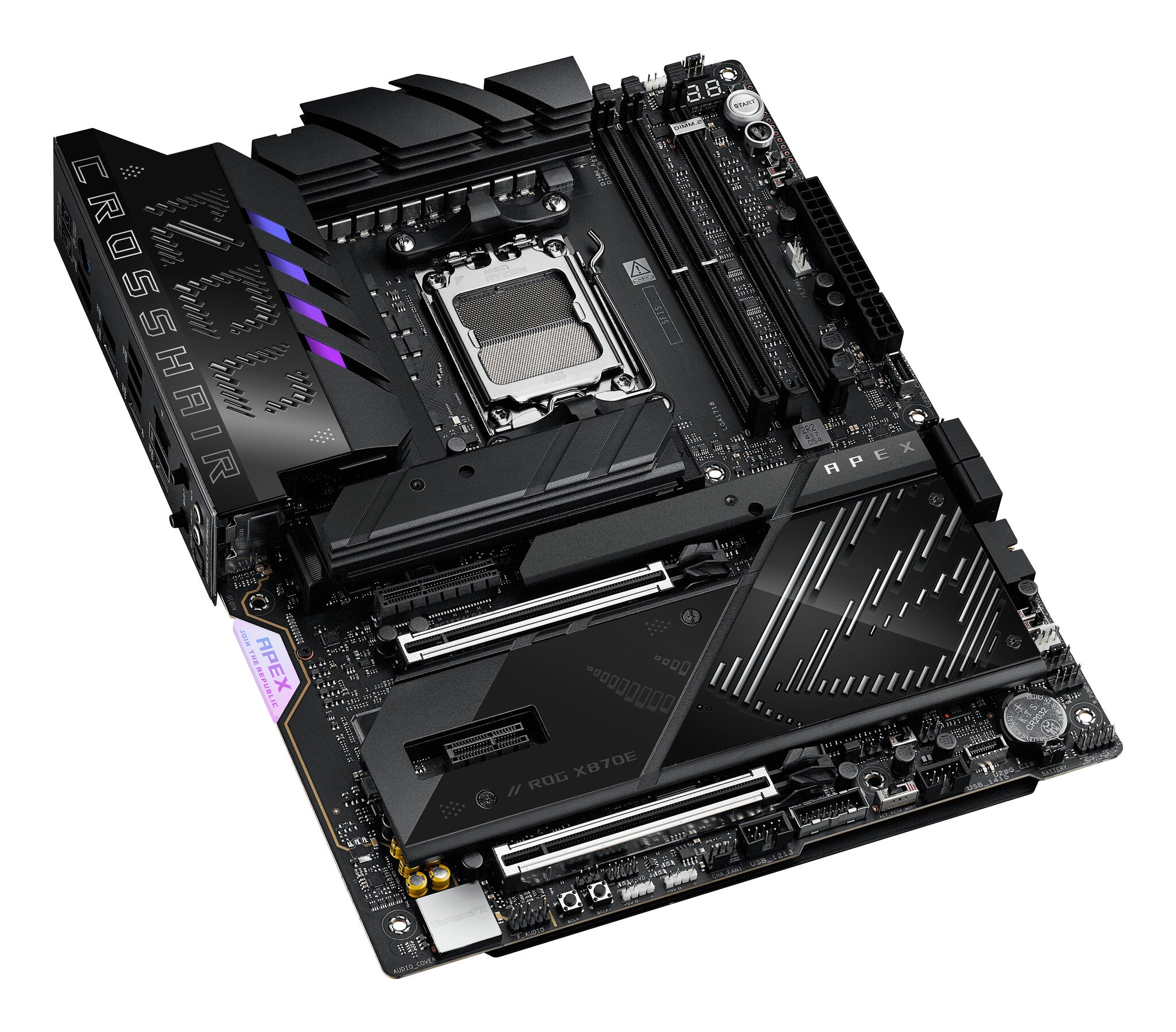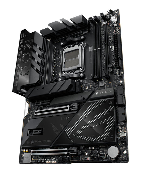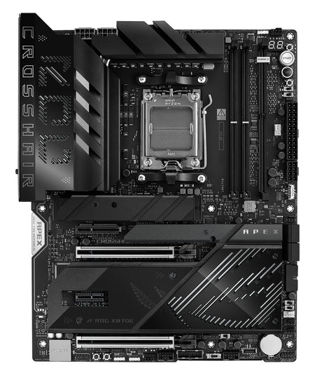 AMD X870E (AM5 Socket) ATX motherboard, Advanced AI PC-ready, 18+2+2 power stages, Dynamic OC Switcher, Core Flex, DDR5 slots with AEMP, ROG Memory Fan Kit for DDR5 overclocking, Wi-Fi 7 with ASUS WiFi Q-Antenna, three PCIe® 5.0 M.2 slots onboard, two PCIe 4.0 slots on an ROG DIMM.2 card, PCIe® 5.0 x16 SafeSlots with PCIe® Slot Q-Release Slim and full support for next-gen graphics cards, two USB4® ports, two USB 20Gbps Type-C® front-panel connectors (one with Quick Charge 4+ up to 60W and USB Wattage Watcher), AI Overclocking, AI Cooling II, and AI Networking II