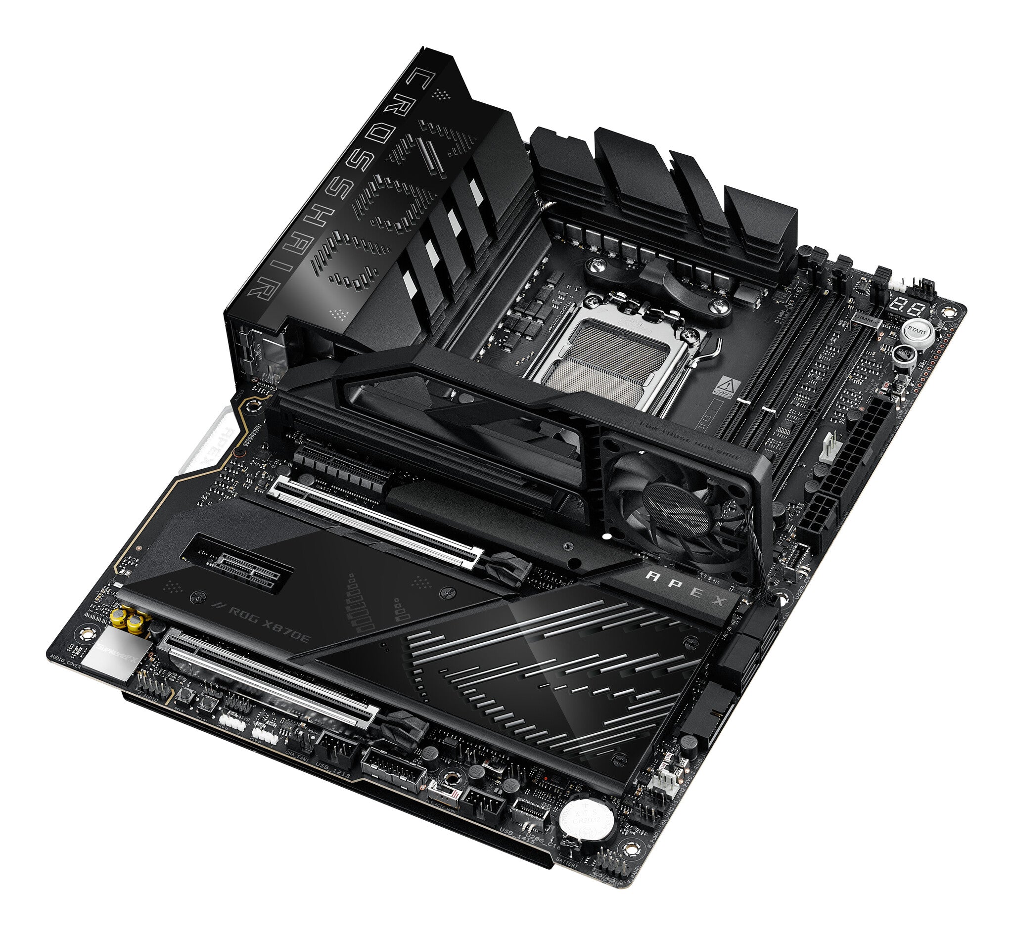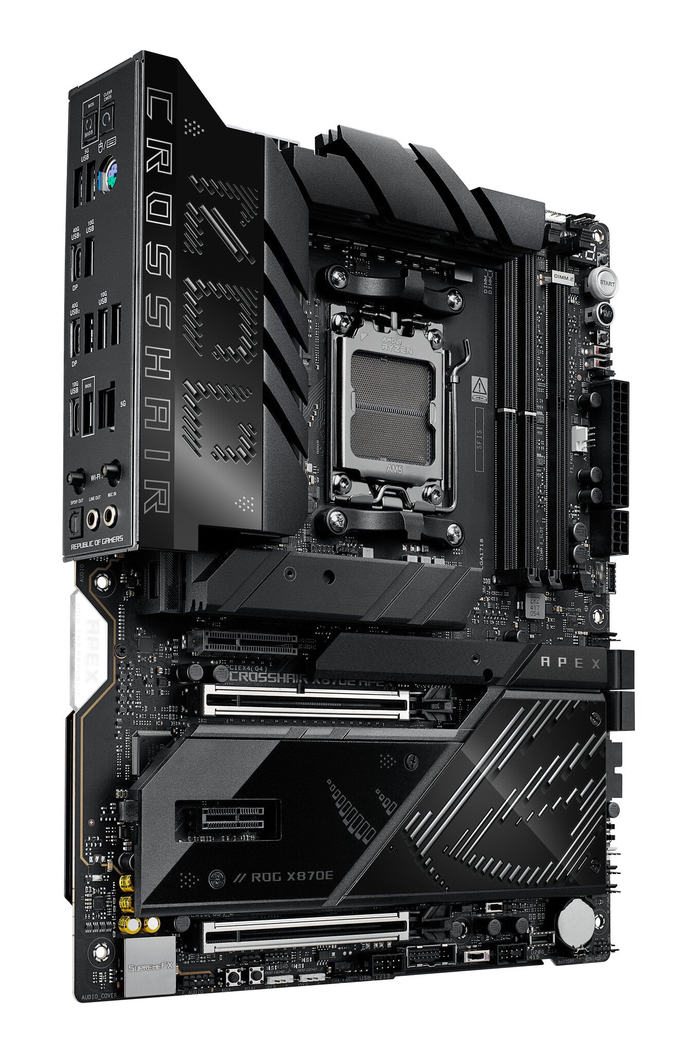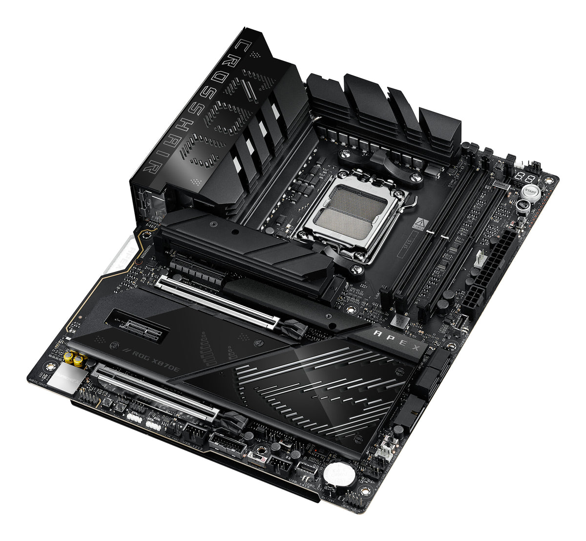 AMD X870E (AM5 Socket) ATX motherboard, Advanced AI PC-ready, 18+2+2 power stages, Dynamic OC Switcher, Core Flex, DDR5 slots with AEMP, ROG Memory Fan Kit for DDR5 overclocking, Wi-Fi 7 with ASUS WiFi Q-Antenna, three PCIe® 5.0 M.2 slots onboard, two PCIe 4.0 slots on an ROG DIMM.2 card, PCIe® 5.0 x16 SafeSlots with PCIe® Slot Q-Release Slim and full support for next-gen graphics cards, two USB4® ports, two USB 20Gbps Type-C® front-panel connectors (one with Quick Charge 4+ up to 60W and USB Wattage Watcher), AI Overclocking, AI Cooling II, and AI Networking II