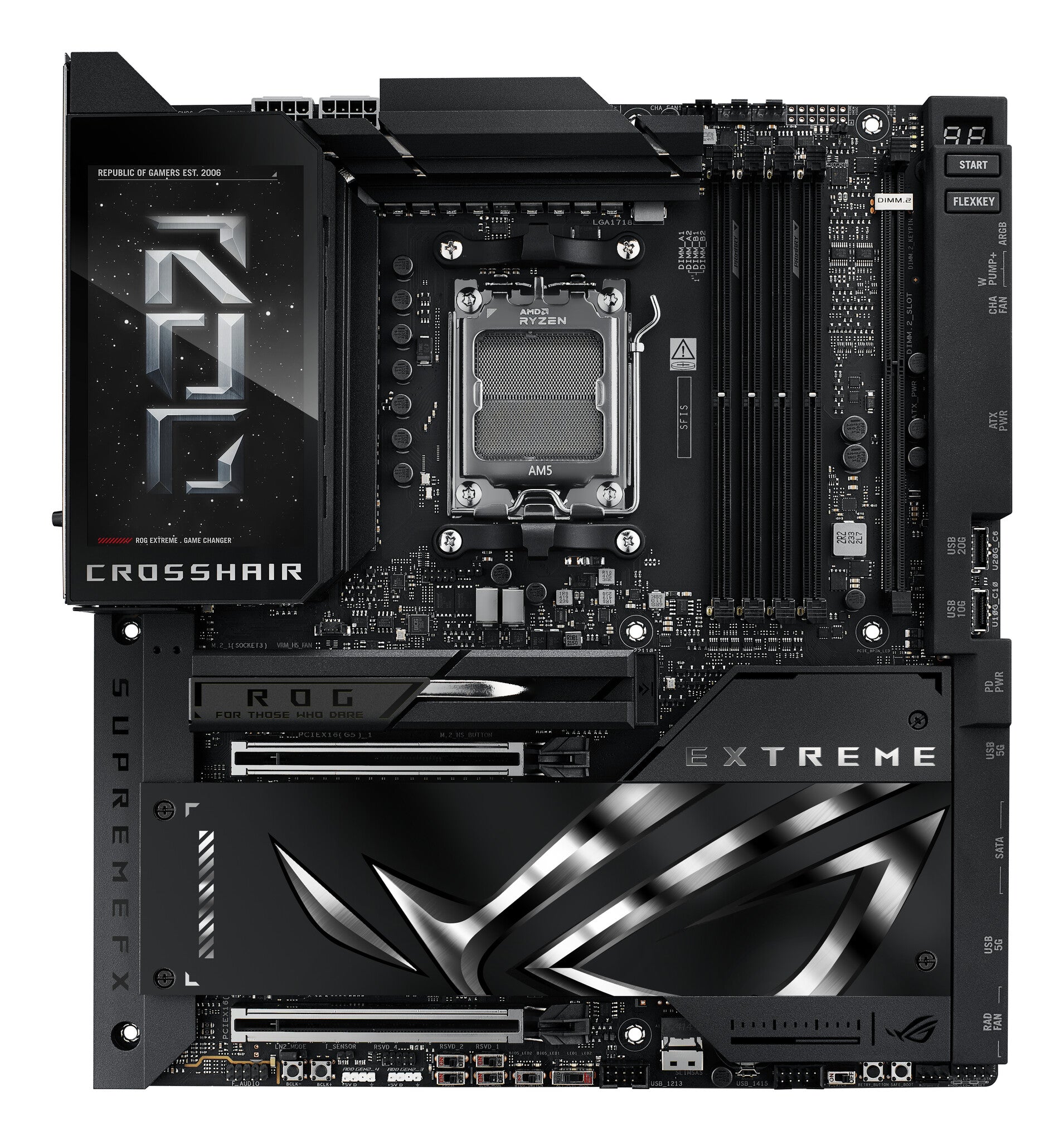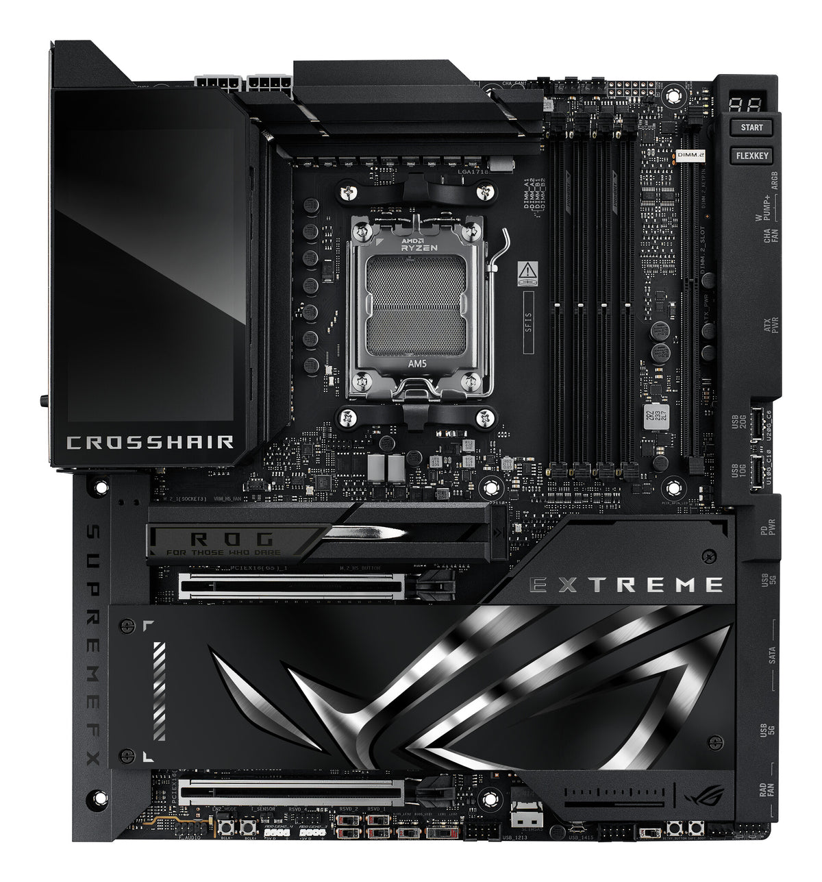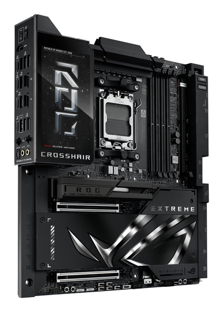 The ROG Crosshair X870E Extreme is the flagship AMD Ryzen™ 9000 series motherboard, designed for the most discerning users. It provides the ultimate foundation for AM5 CPUs, DDR5 memory, and PCIe® 5.0 components to ensure maximum performance and future-readiness. Its comprehensive connectivity includes USB4®, and the integrated 5-inch LCD offers a unique way to monitor system performance or add a touch of personalized style.