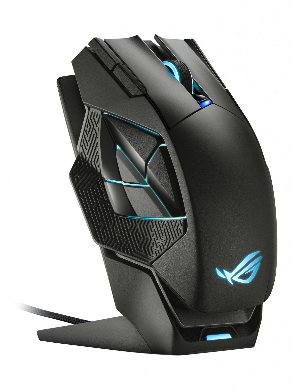 Wireless gaming mouse with dual-mode connectivity (wired / 2.4 GHz) with magnetic charging stand, 12 programmable buttons, specially tuned ROG 19,000 dpi sensor, Exclusive Push-Fit Switch Sockets, ROG Micro Switches, ROG Paracord and Aura Sync RGB lighting