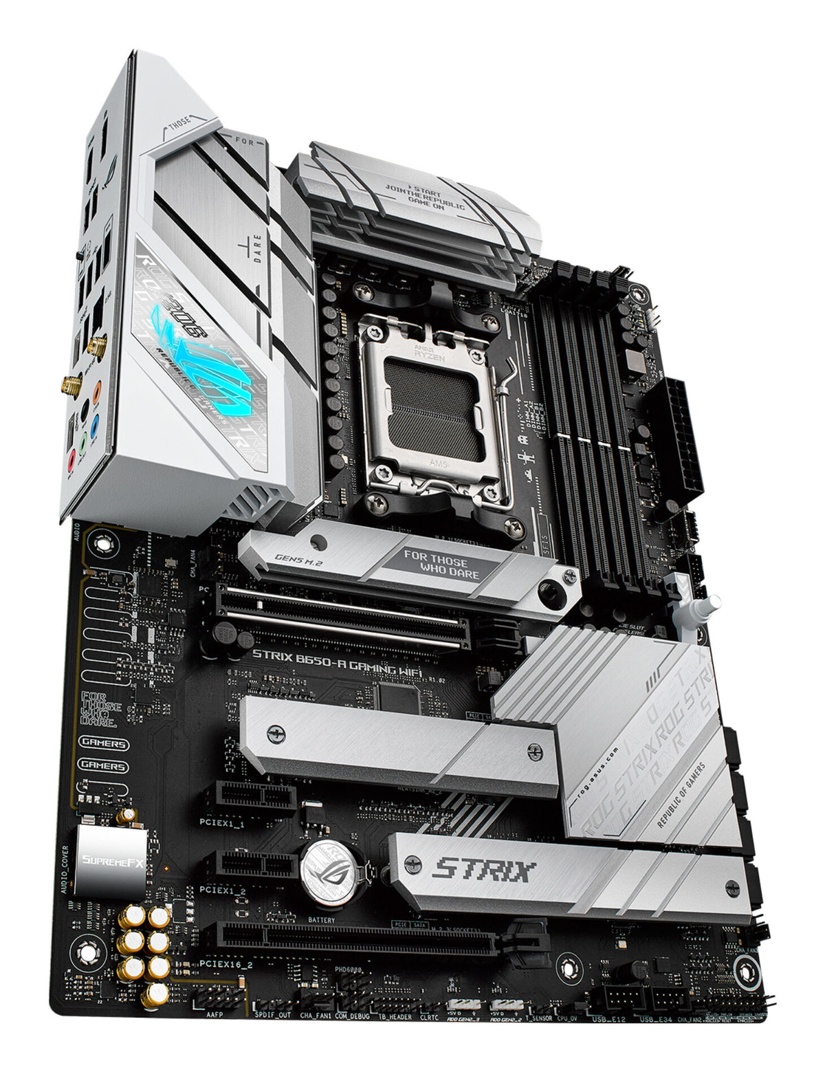 A bold silver and white aesthetic with a dash of RGB lighting delivers a build that looks as futuristic as its feature set. A meld of form and function is illustrated by a cut-out I/O shield, which allows additional airflow to pass through the VRM heatsink channels below. This design encompases the M.2 and chipset heatsinks as well, and the whole look is tied together with game-centric decals. Pair the Strix B650-A with other products from the diverse ROG ecosystem to create a fully-customized gaming setup that reflects your personal style.