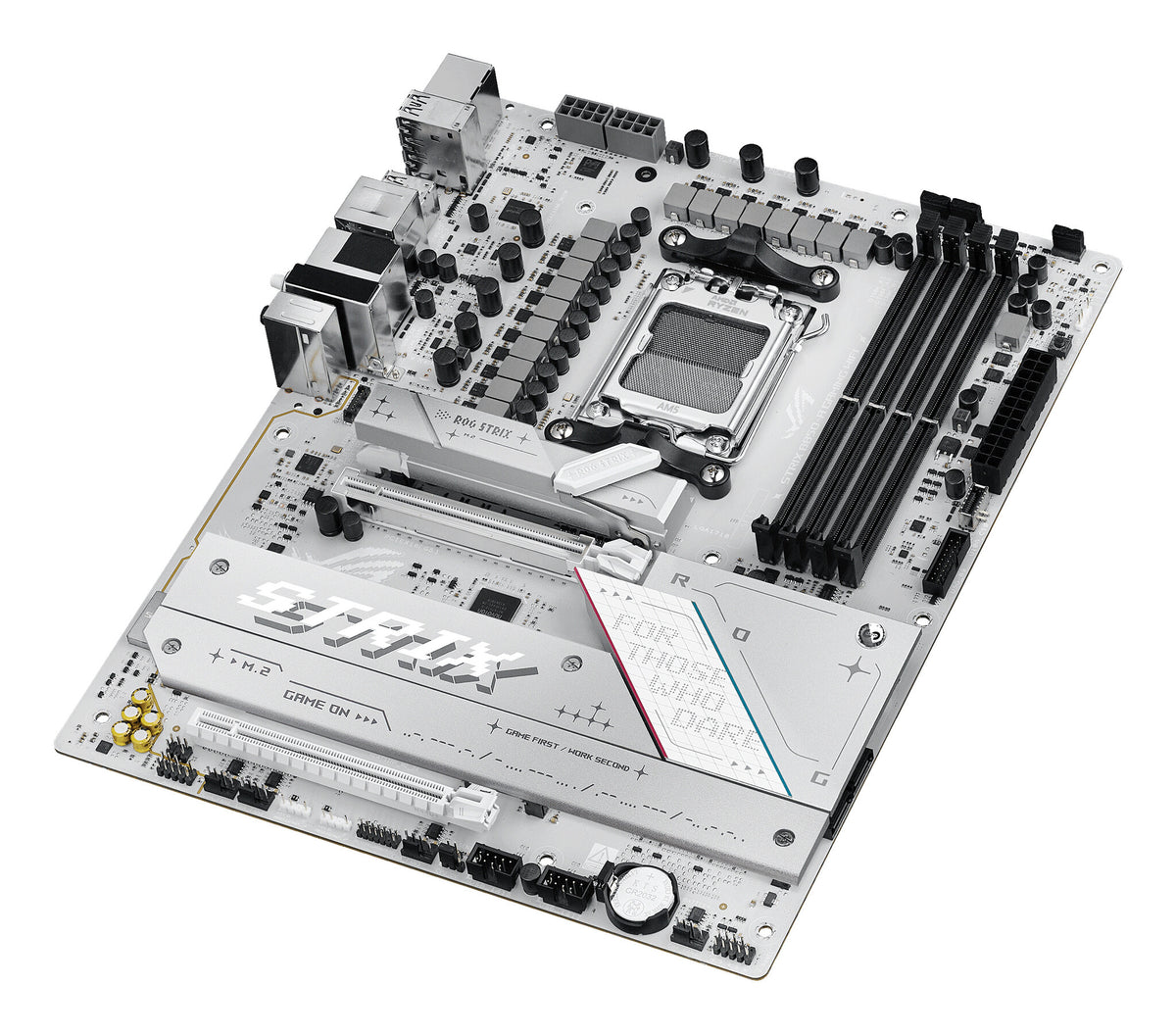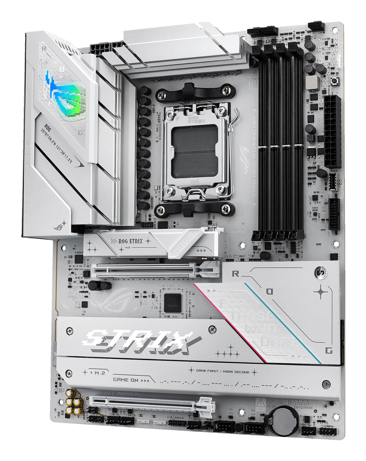 The ROG Strix B850-A stands out with its striking white PCB, offering a fresh and modern aesthetic that seamlessly complements almost any system build. The matching metallic heatsinks enhance its clean, crisp look, while subtle RGB lighting on the I/O shroud allows you to either maintain a sleek, understated appearance or showcase a bold, luminous design.