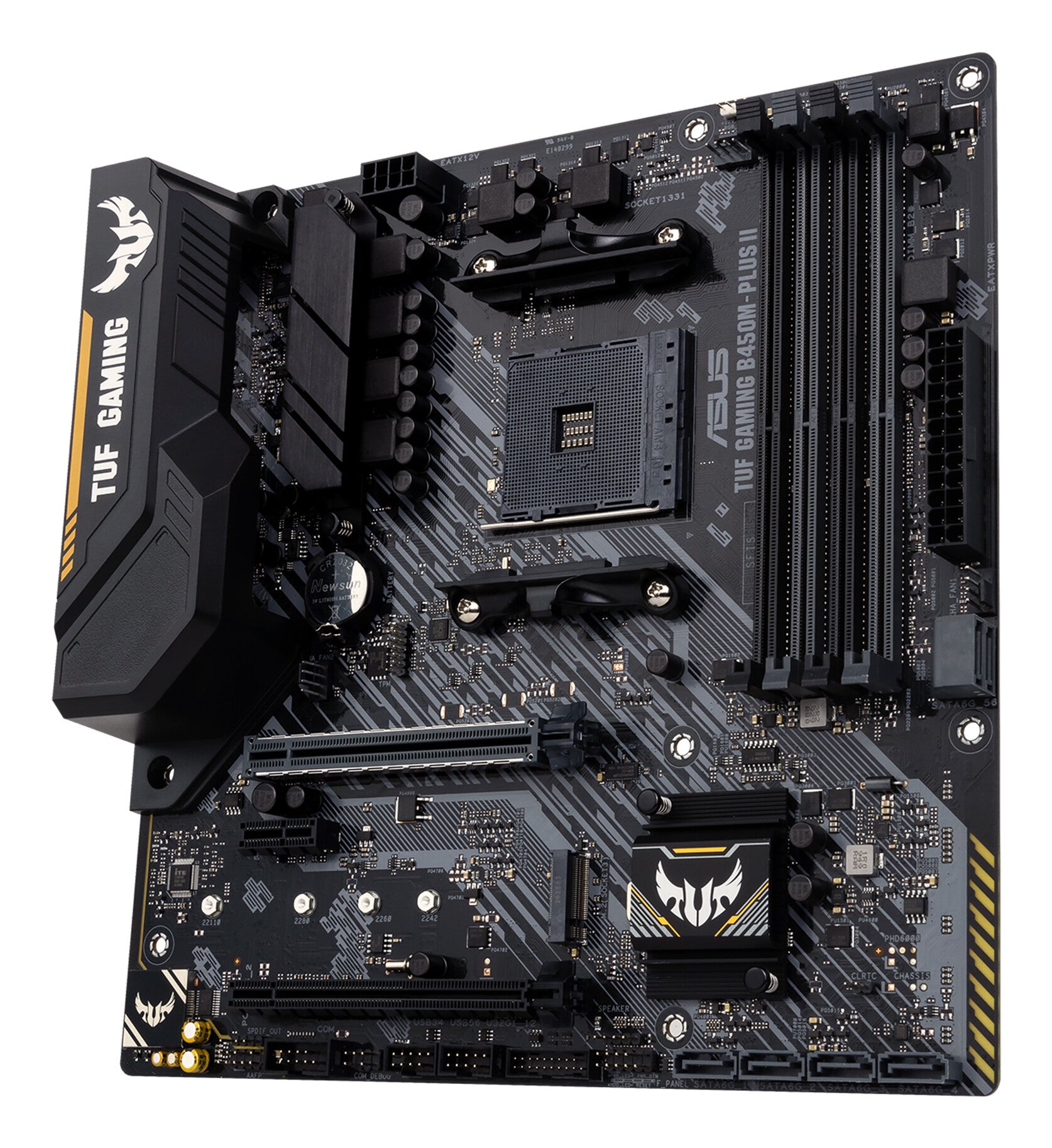 TUF GAMING B450M-PLUS II provides a complete, high-performance gaming package with a long list of features to improve your experience, including ultrafast networking for smoother online gameplay, pristine audio with positional cues for FPS gaming, and onboard RGB lighting that syncs with attached accessories to help you create a personalized gaming atmosphere.