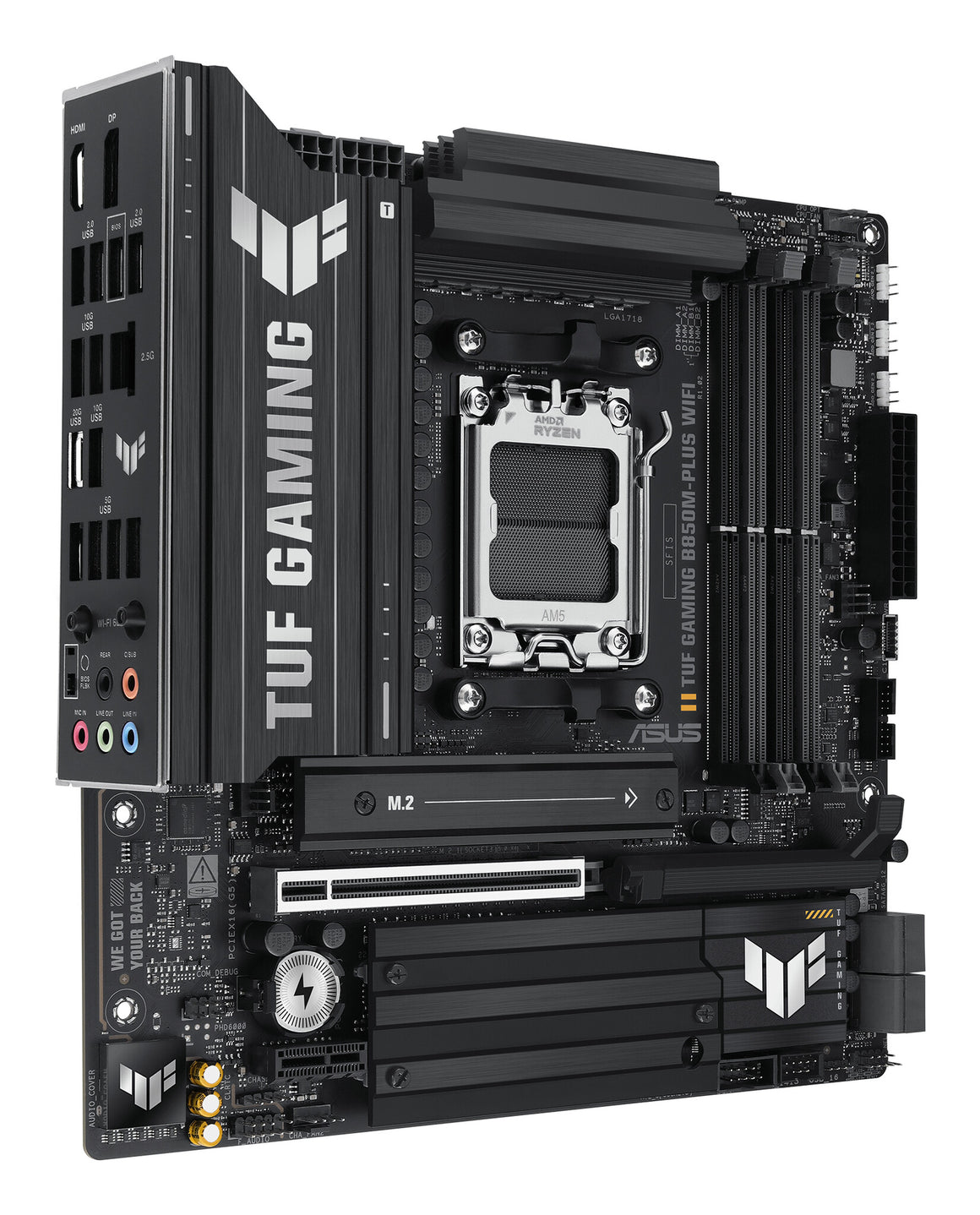 ASUS TUF GAMING B850M-PLUS WIFI takes all the essential elements of the latest AMD Ryzen™ processors and combines them with game-ready features and proven durability. Engineered with military-grade components, an upgraded power solution and a comprehensive cooling system, this motherboard goes beyond expectations with rock-solid and stable performance for marathon gaming. TUF GAMING motherboards also undergo rigorous endurance testing to ensure that they can handle conditions where others may fail. This platform delivers the power and connectivity that advanced AI PC applications demand.