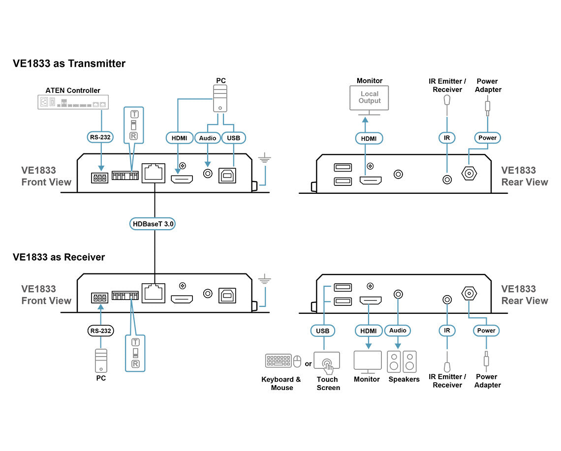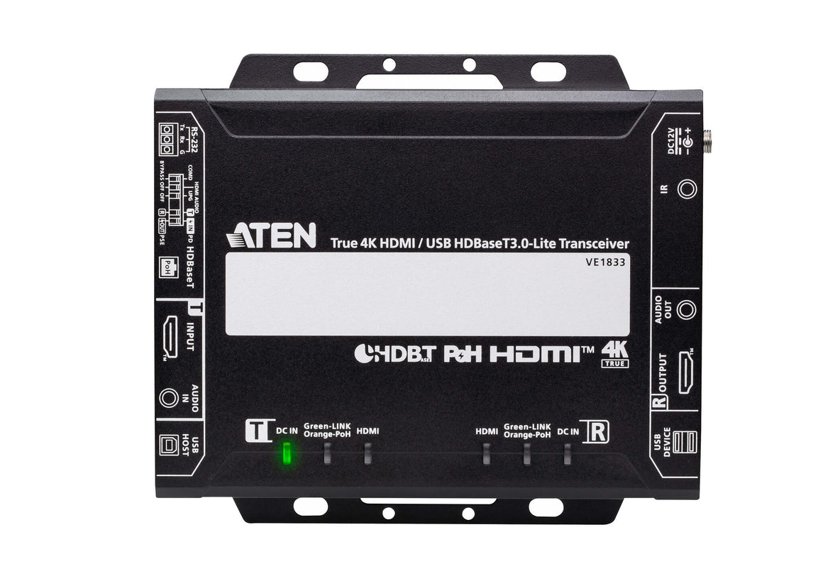 The ATEN VE1833 True 4K HDMI / USB HDBaseT 3.0 - Lite Transceiver with PoH integrates both transmitter and receiver functions in one compact unit, allowing users to flexibly configure it through a DIP switch according to diverse AV setup. Leveraging HDBaseT 3.0 technology, the VE1833 delivers uncompressed True 4K HDMI signals over distances up to 40 m via a single Cat 6a cable (HDBaseT 3 Certified Cat 6a U/FTP / ATEN's tailor-made HDBaseT cable*), with zero.