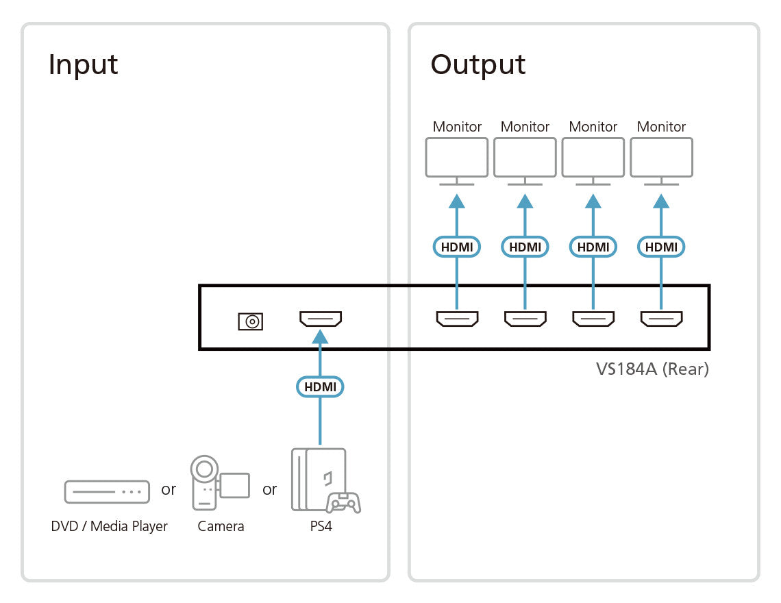 The VS184A HDMI Splitter is the perfect solution for anyone who needs to send one source of digital high definition video to four displays at the same time. It supports all HDMI-enabled equipment, such as DVD players, satellite set-top boxes and all HDMI displays.