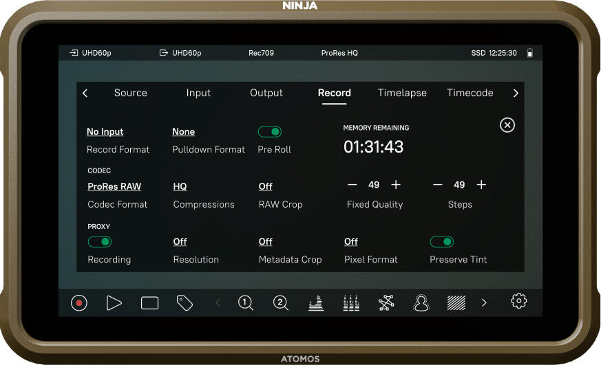 The AtomRemote app for iOS and macOS has an array of controls for Ninja via Atomos Connect. It lets you configure and control your Ninja from up to 15 meters away via Bluetooth LE while you define camera connections, select Gamma/EOTF and adjust Gamut settings. AtomRemote can control playback, select monitoring modes, apply custom 3D LUTs, and view image analysis tools, including exposure and focus. Output controls include options for 4K to HD, LUT preview and HDR output.