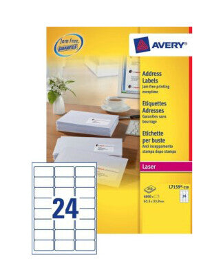 Mailings are made easier when you use the unique QuickPEEL™ feature on these 24 to a sheet white address labels. You simply divide your favourite 24 labels per sheet along the perforation to expose the label edges and then peel and apply to your envelopes. You can of course also peel and apply each label in the normal way. Avery® eco-friendly QuickPEEL™ laser labels don’t just save you time, they can help protect the environment too as they’re made from FSC certified paper and can be recycled with your normal office paper waste. The value in this 250 sheet pack is great for large mailings and with the Avery JamFREE™ guarantee you’ll get peace of mind that there’ll be no printer jams holding things up either. Did you also know that you can create bespoke labels by adding your own designs, images and company logo’s onto all our A4 sheet labels?