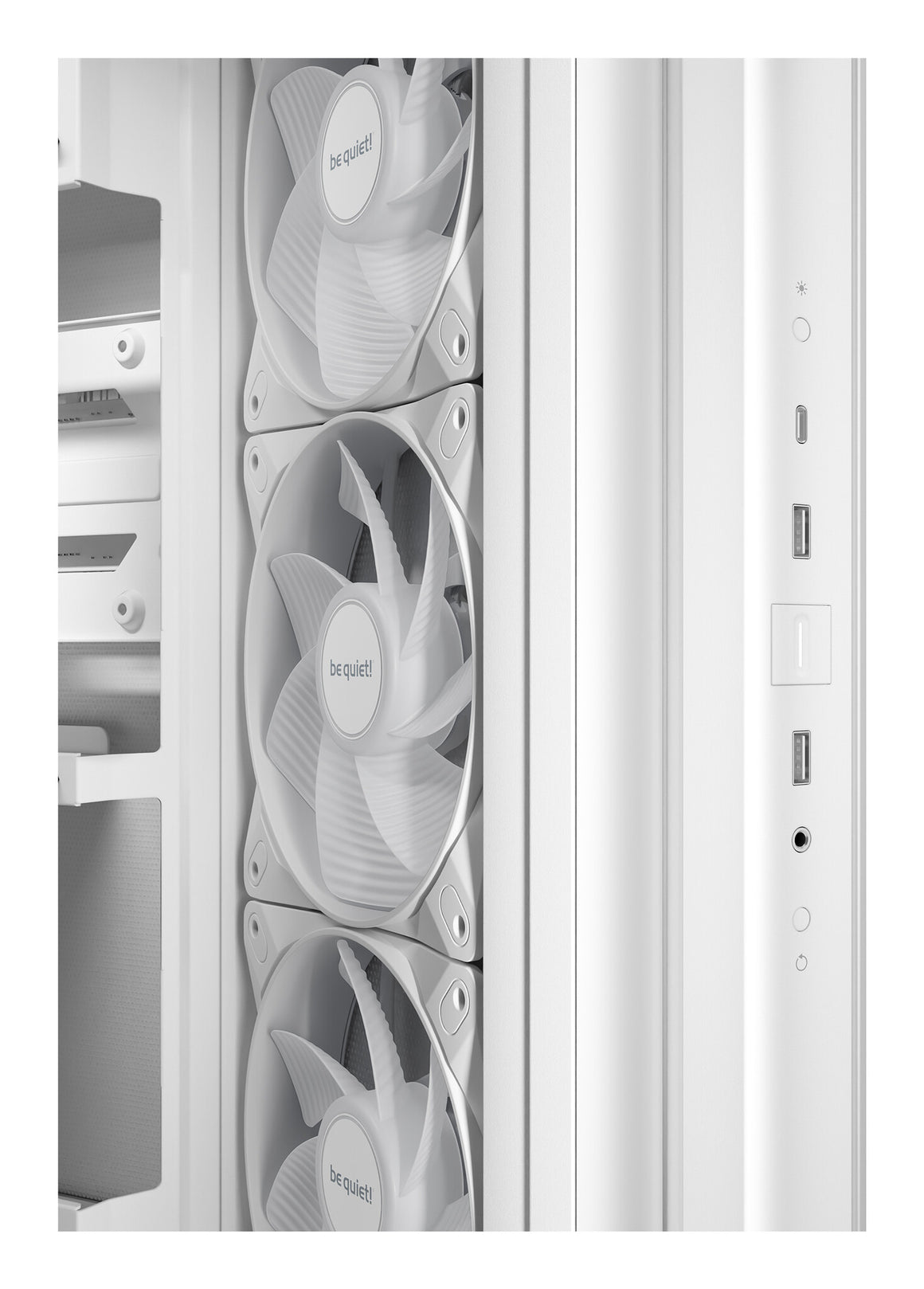 Light Base 500 LX White features 4 preinstalled Light Wings LX fans. The rear fan is a Light Wings LX 120mm White, the fans on the side are Light Wings LX 120mm PWM White fans with reversed fan blades. All fans feature 16 LEDs inside their hub of the impeller, making for an unmistakable ARGB illumination. The reversed fan blades make sure that their pretty side is visible at all times.
