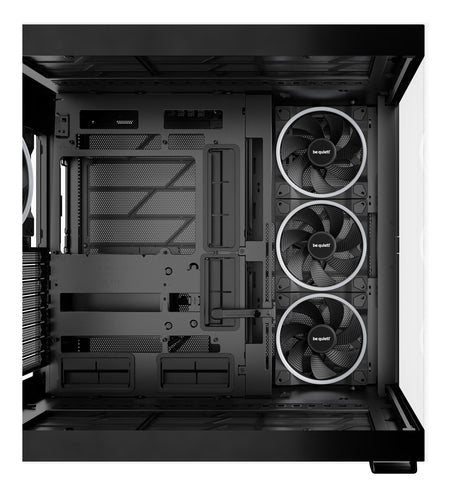 Light Base 900 FX Black comes with 4 pre-installed Light Wings fans. One fan is installed as rear exhaust, 3 Light Wings 140mm PWM fans with reversed fan blades are pre-installed on the side mounting. The reverse fans make sure your system is still an eye-catcher when installed as a side intake. Their 7 airflow-optimized fan blades not only reduce noise-generating turbulences but also ensure that this fan provides the performance that is needed, even in demanding configurations.