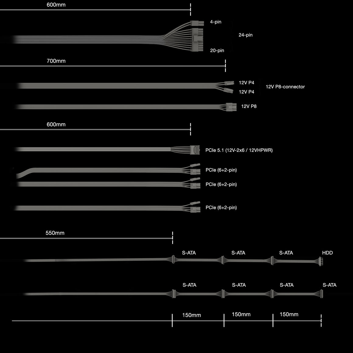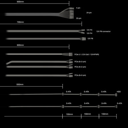 Power Zone 2 1000W is an ATX 3.1 PSU and comes with both native integration of the 12V-2x6 connector for next-generation PCIe 5.1 graphics cards, and 3 PCIe 6+2-pin connectors for support of current-gen GPUs. A 90° angled 12V-2x6 connector in the scope of delivery leaves no doubt that this PSU is here to stay. All of this makes Power Zone 2 1000W extremely versatile and the perfect choice for powerful systems of today and the ones to come.