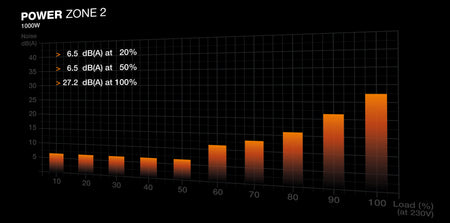A large Pure Wings 3 140mm fan is keeping Power Zone 2 1000W cool. While under low load, the fan turns off completely until its services are needed again for more demanding operations. This post-ventilation requires a short cooldown period of 2-5 minutes to avoid frequent and annoying starts and stops of the fan. Combined with the large fan for active cooling, this power supply is exceptionally silent in all load scenarios.